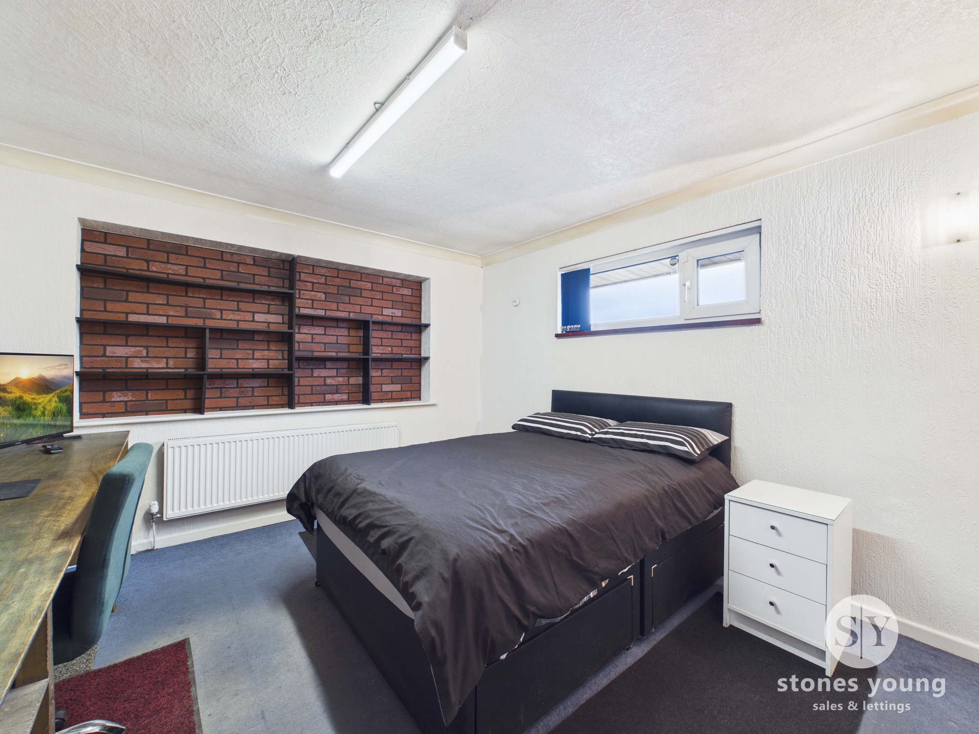 Carpet flooring, uPVC double glazed window x2, panel radiator x2, gas fire in stone surround, TV point.