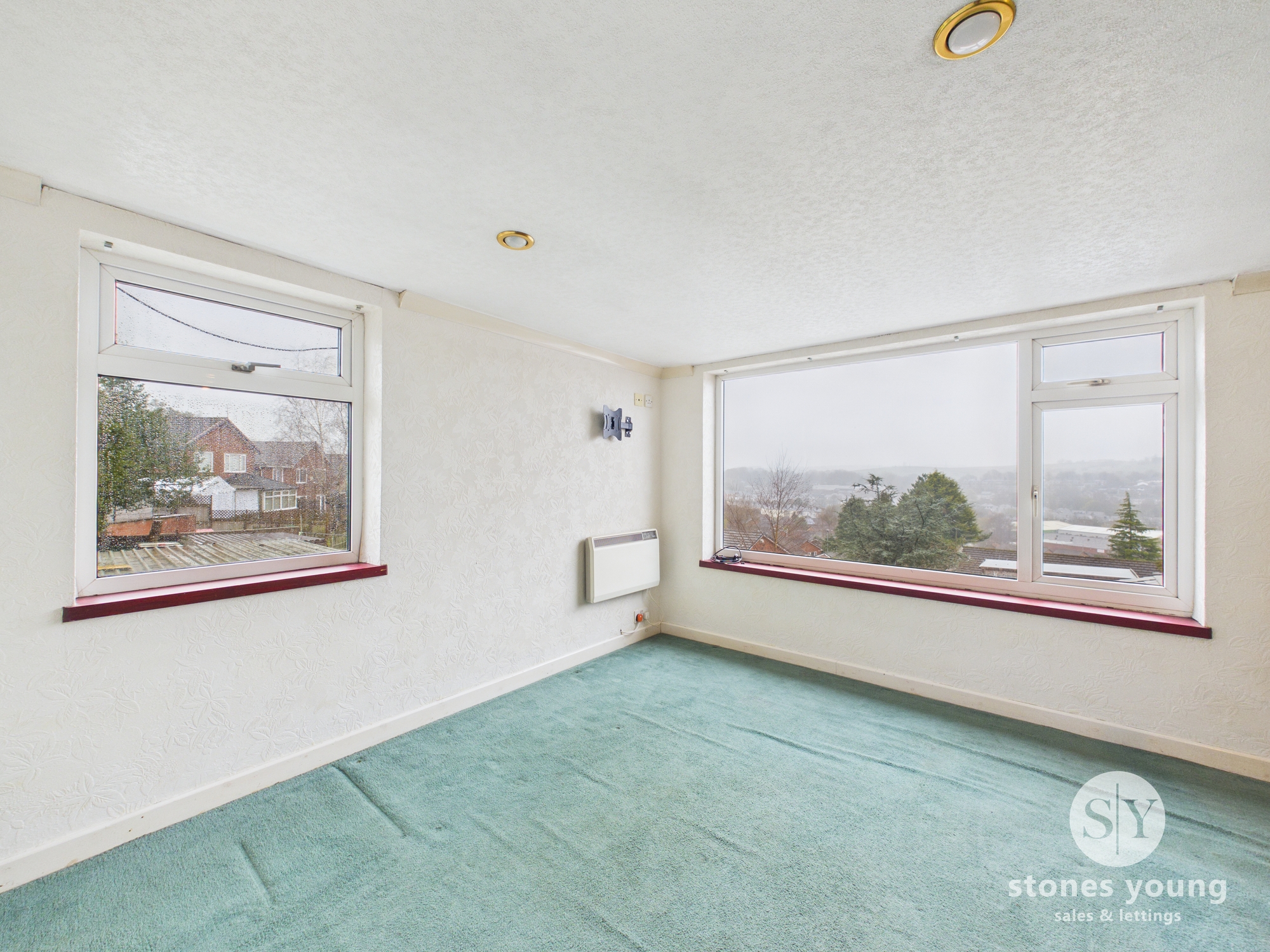 Carpet flooring uPVC double glazed window x2, electric storage heater.