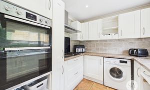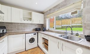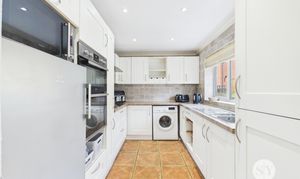 Tiled flooring, range of wall and base units and contrasting work surfaces, integrated 4x ring gas hob, extractor fan, grill, oven, fridge , stainless steel sink and drainer, space and plumbing for washing machine, uPVC double glazed window.