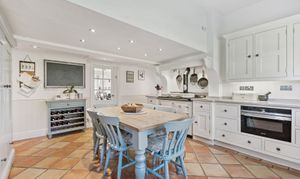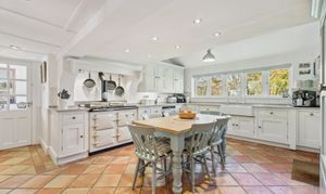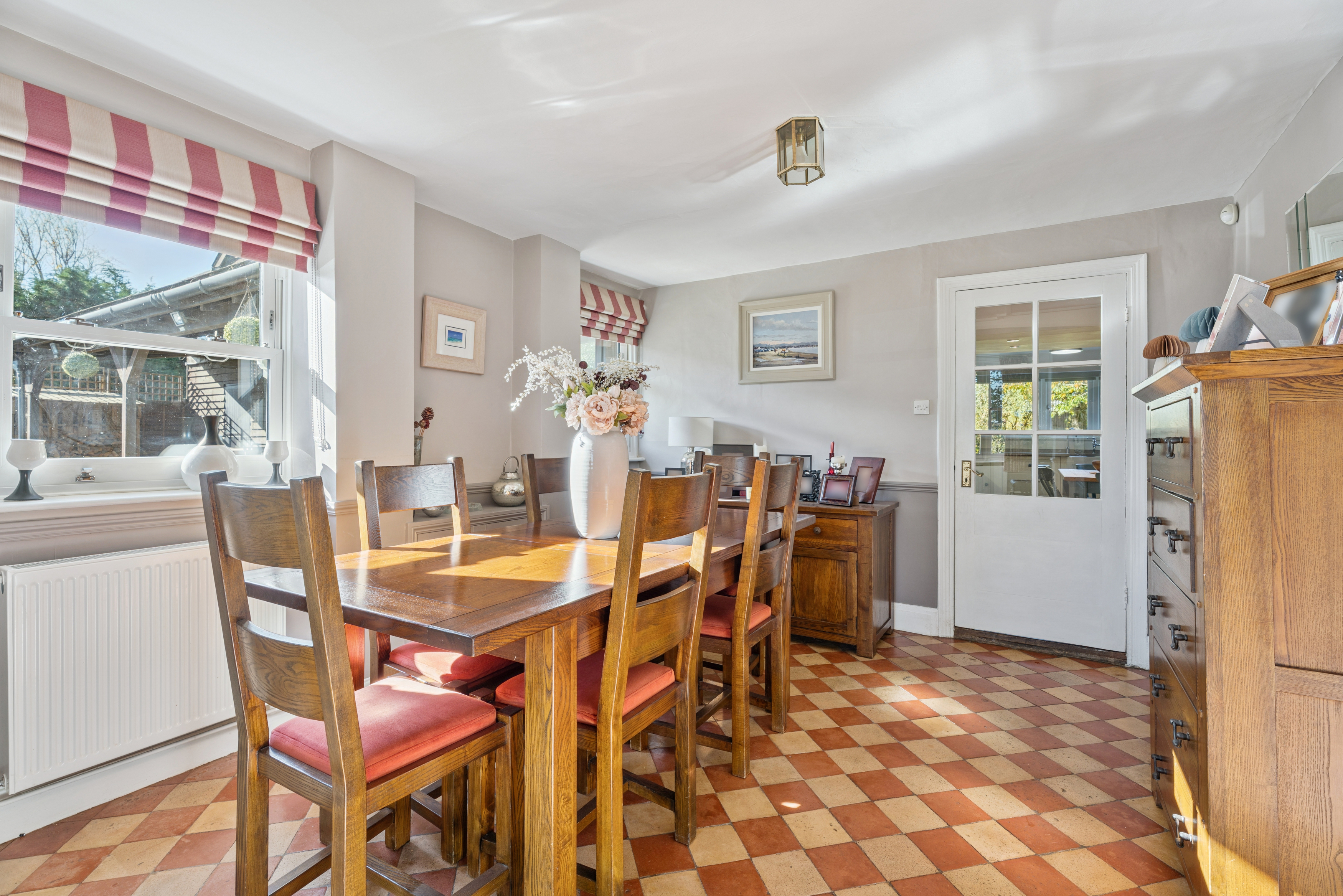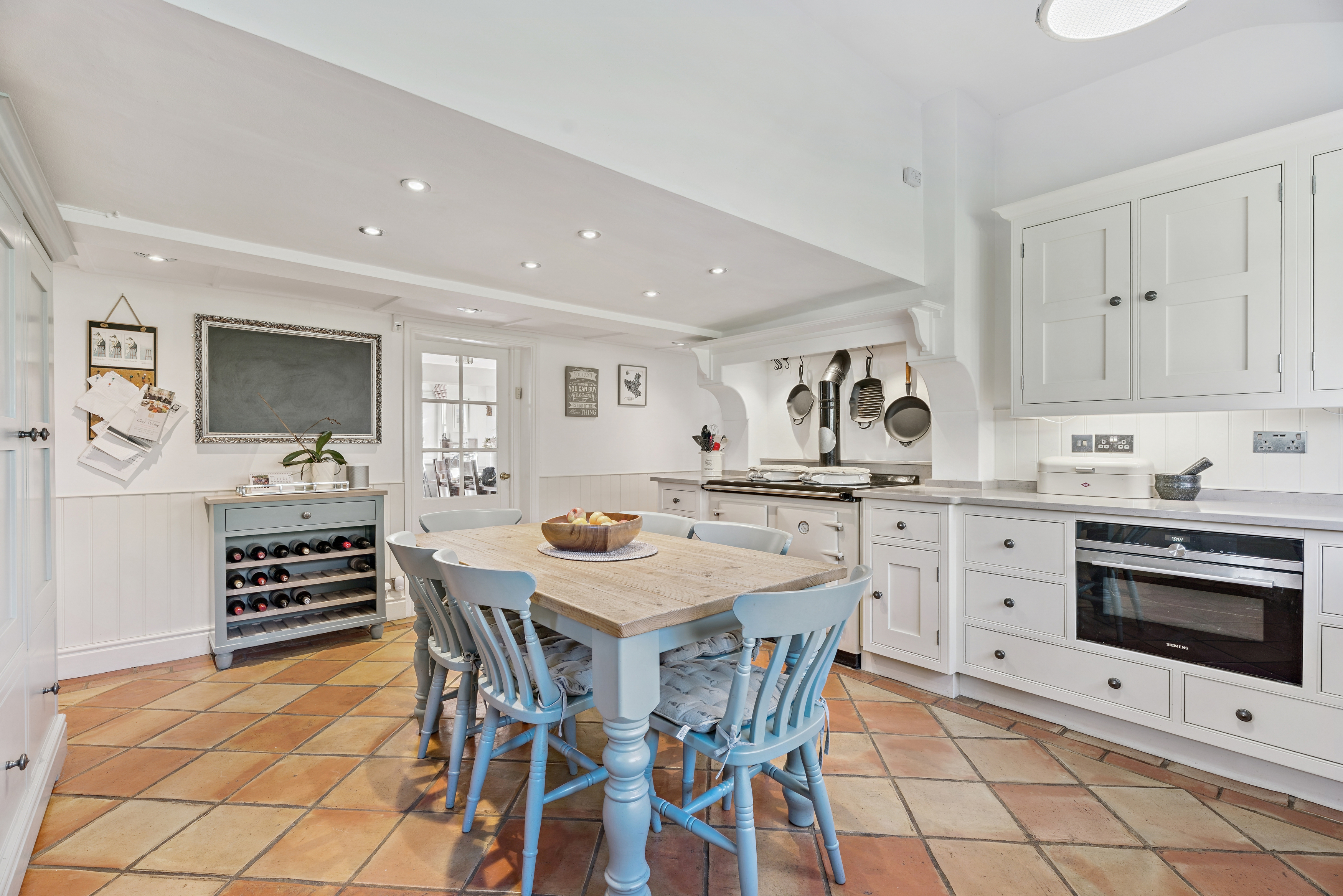 Moving through, the kitchen/breakfast room is approached via the dining room — a timeless country space combining elegance and practicality. Fitted with bespoke cabinetry and a traditional Aga, it’s finished in warm tones with terracotta tiled flooring and generous workspace. There’s ample room for a family breakfast table, making it a natural gathering place for daily life.