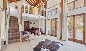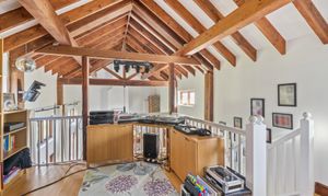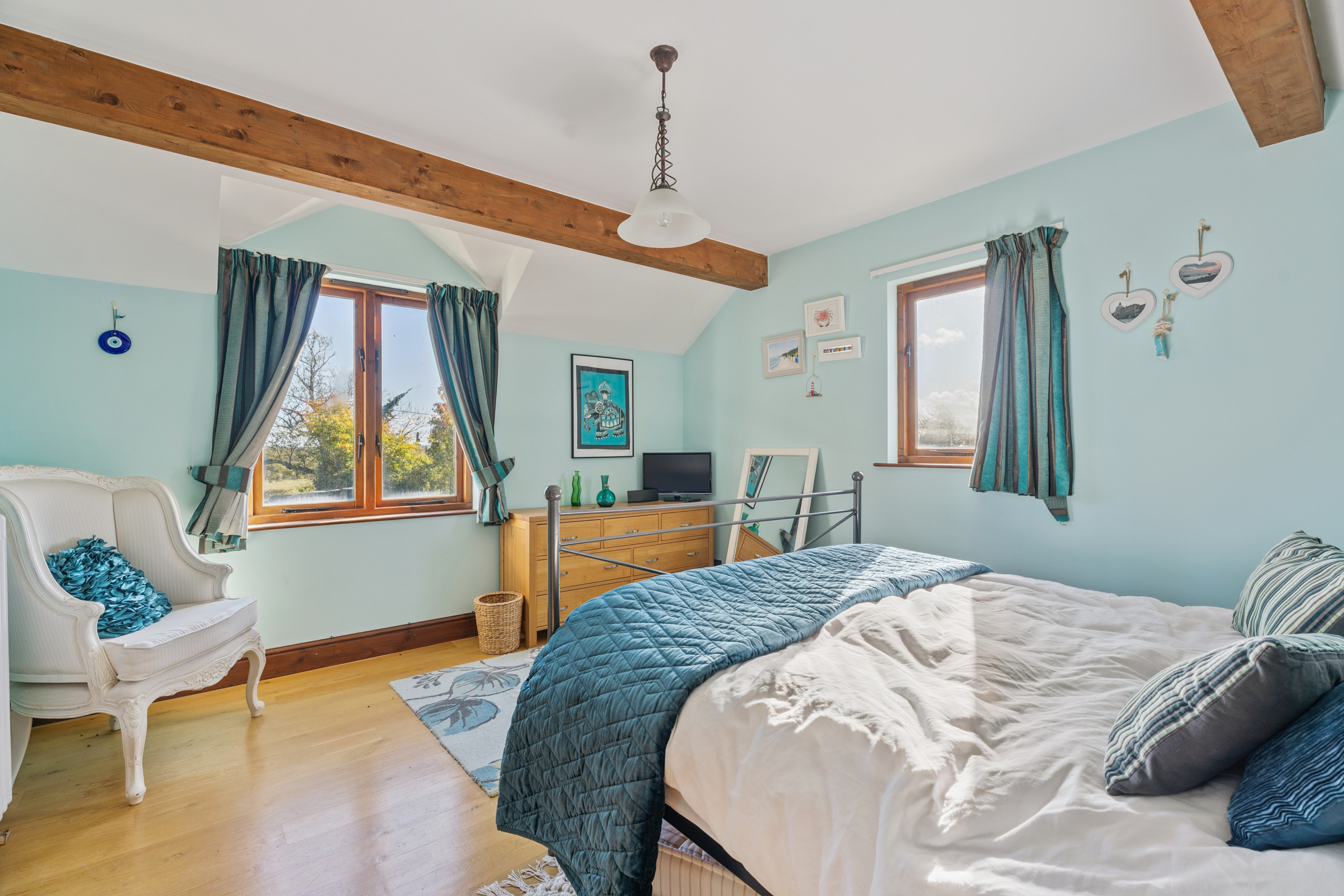 Above the barn wing, a fifth double bedroom with a separate shower room offers a private and flexible space, ideal for guests, teenagers, or extended family. The mezzanine landing provides further scope for use as a study or reading area.
