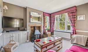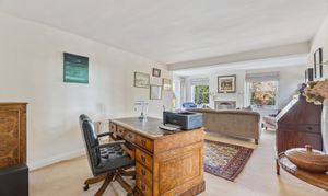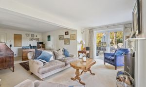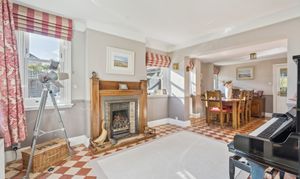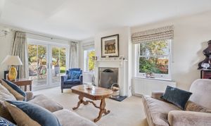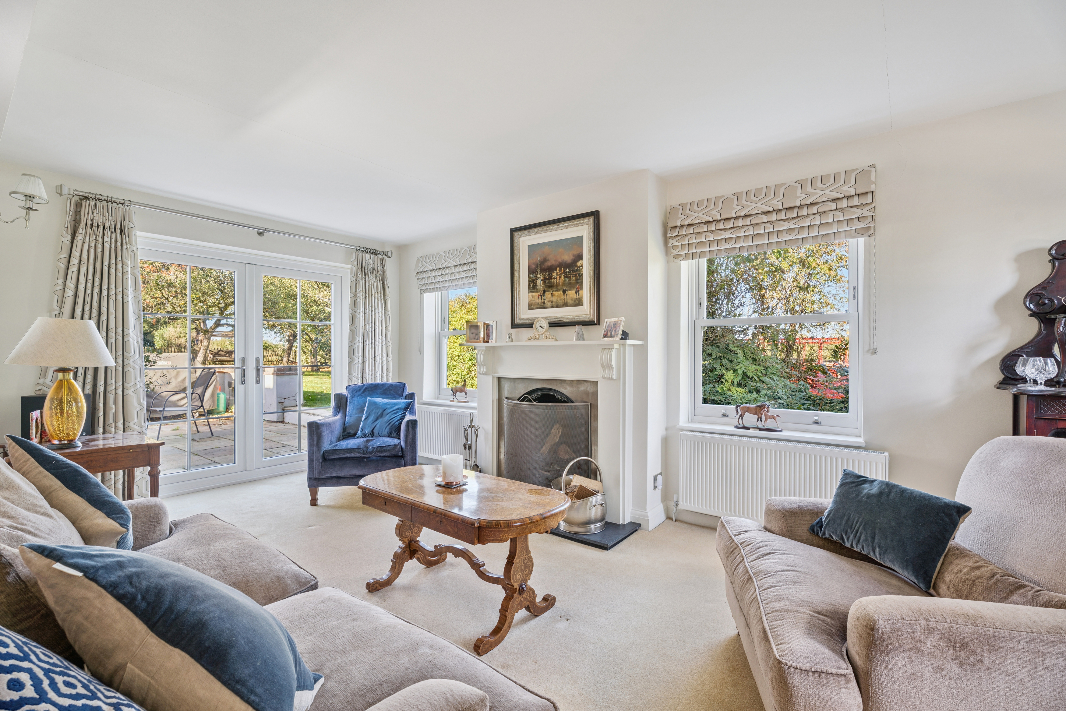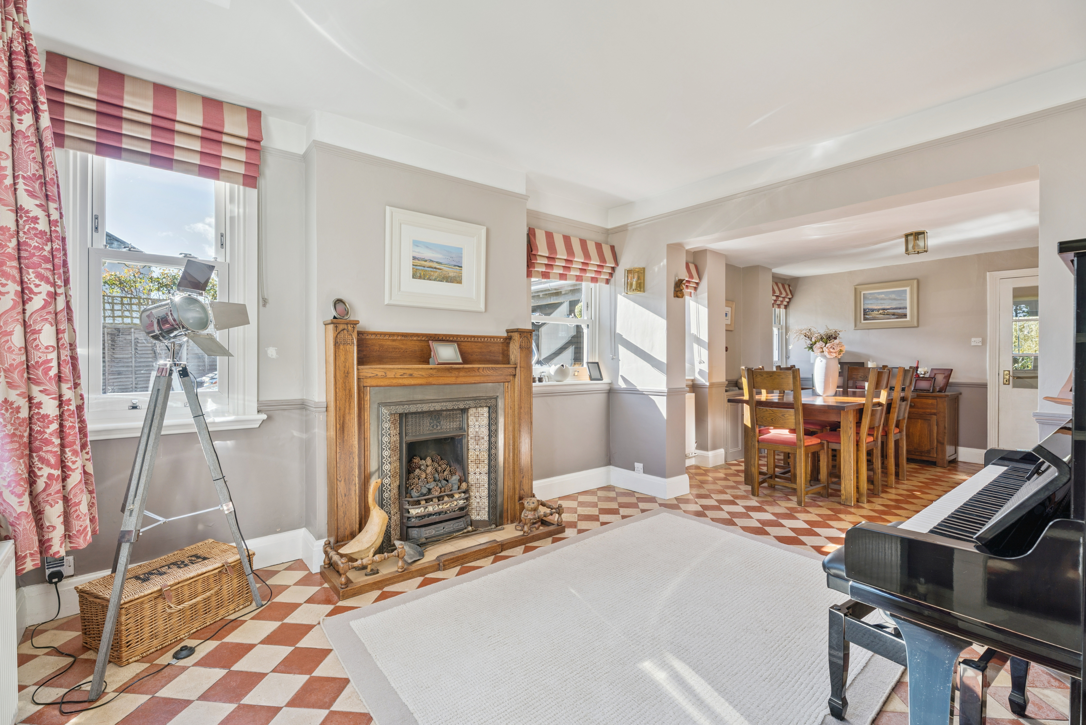 From here, the layout flows naturally into the elegant principal sitting room. This is a grand yet comfortable space, the true heart of the home, defined by triple aspect, handsome fireplace, and garden views that fill the room with light throughout the day.