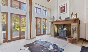 A side entrance from the driveway connects the kitchen directly to the adjoining barn style wing. The adjoining wing is a stunning feature of Highfields Farm, designed with soaring ceilings, exposed beams, striking brick surround fireplace with log burning stove, views across the private rear garden, and a mezzanine level above.