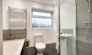 Window to the rear, white bathroom suite comprising a square shower enclosure with thermostatic shower, bath with mixer taps and hand shower attachment, WC, wash basin, towel radiator, partly tiled walls (fully tiled to the shower enclosure) and vinyl flooring.