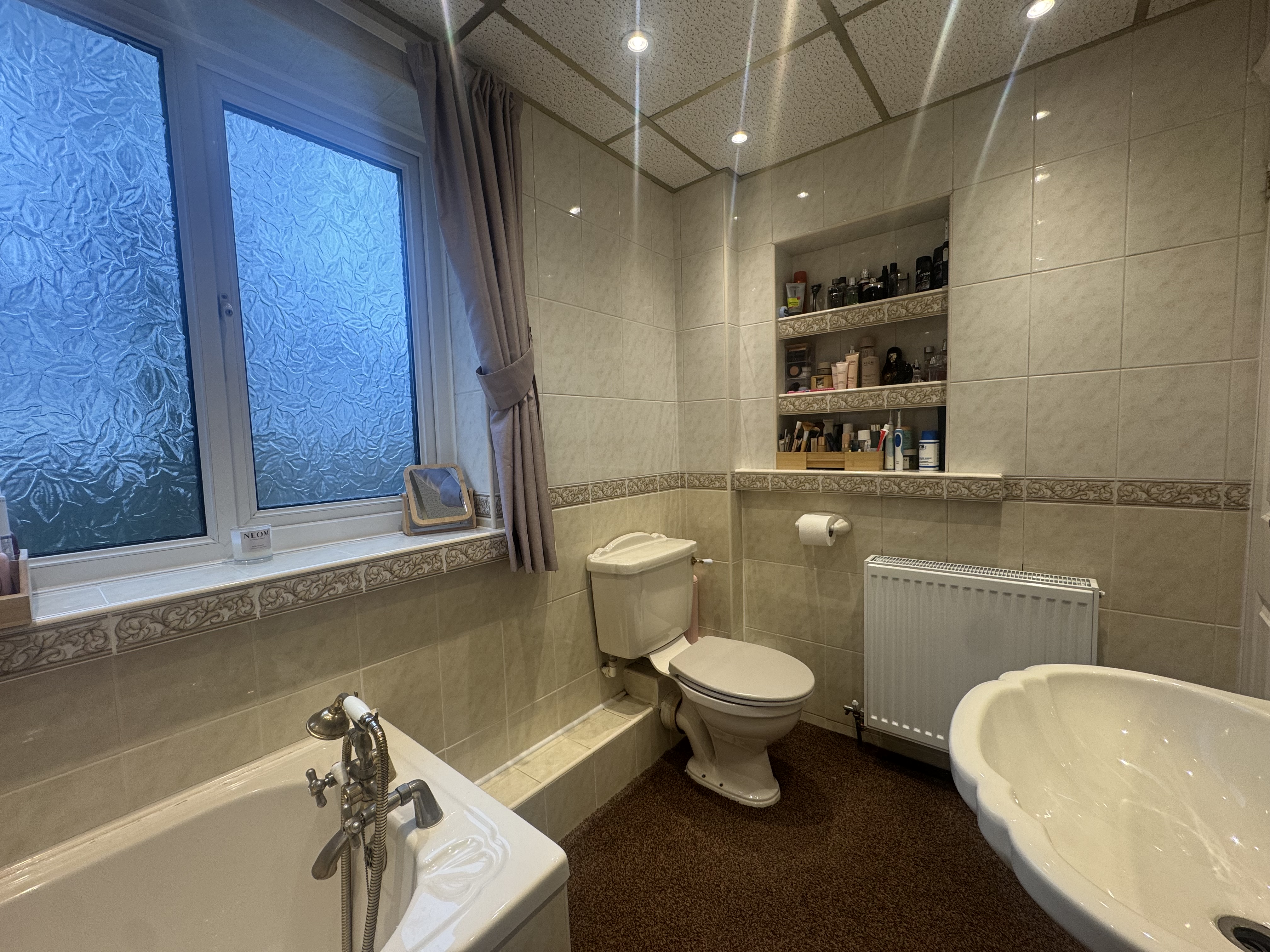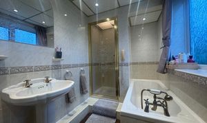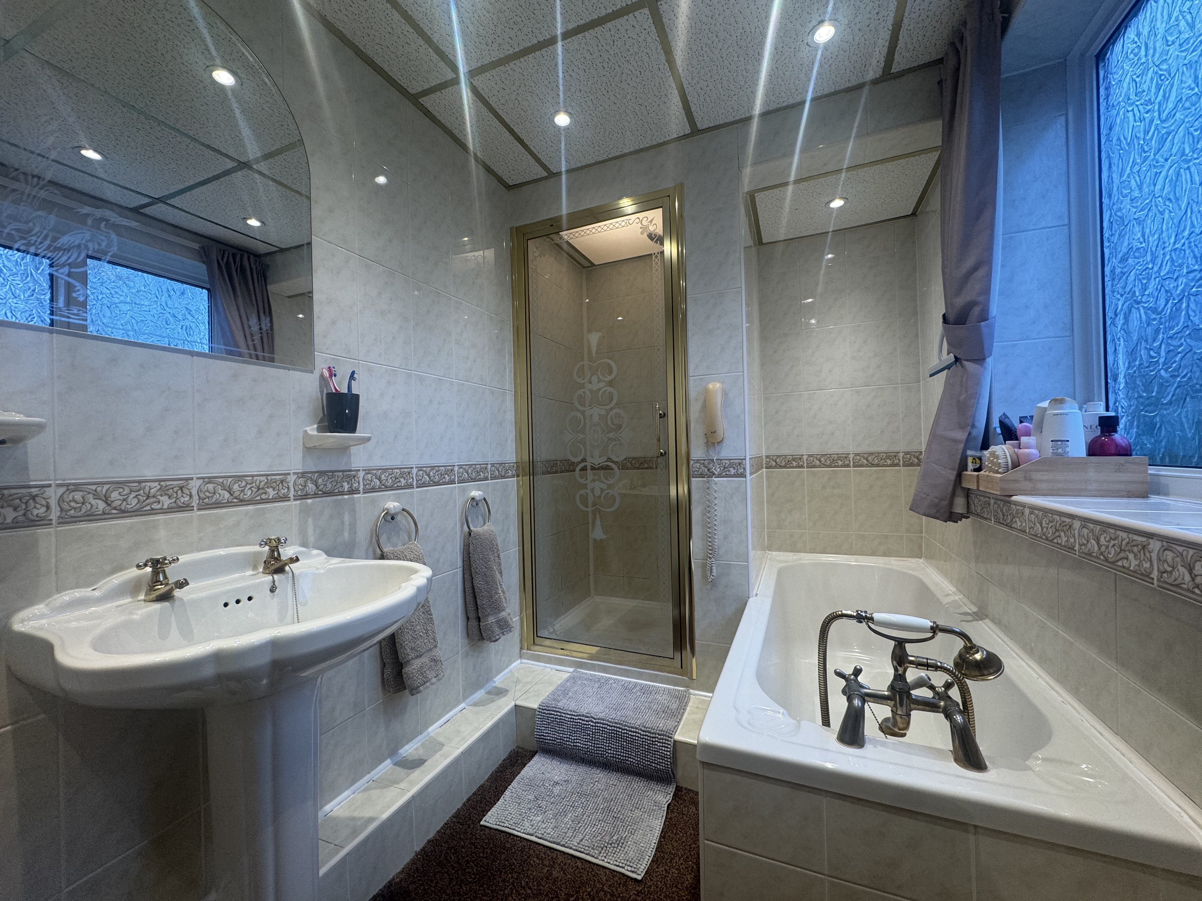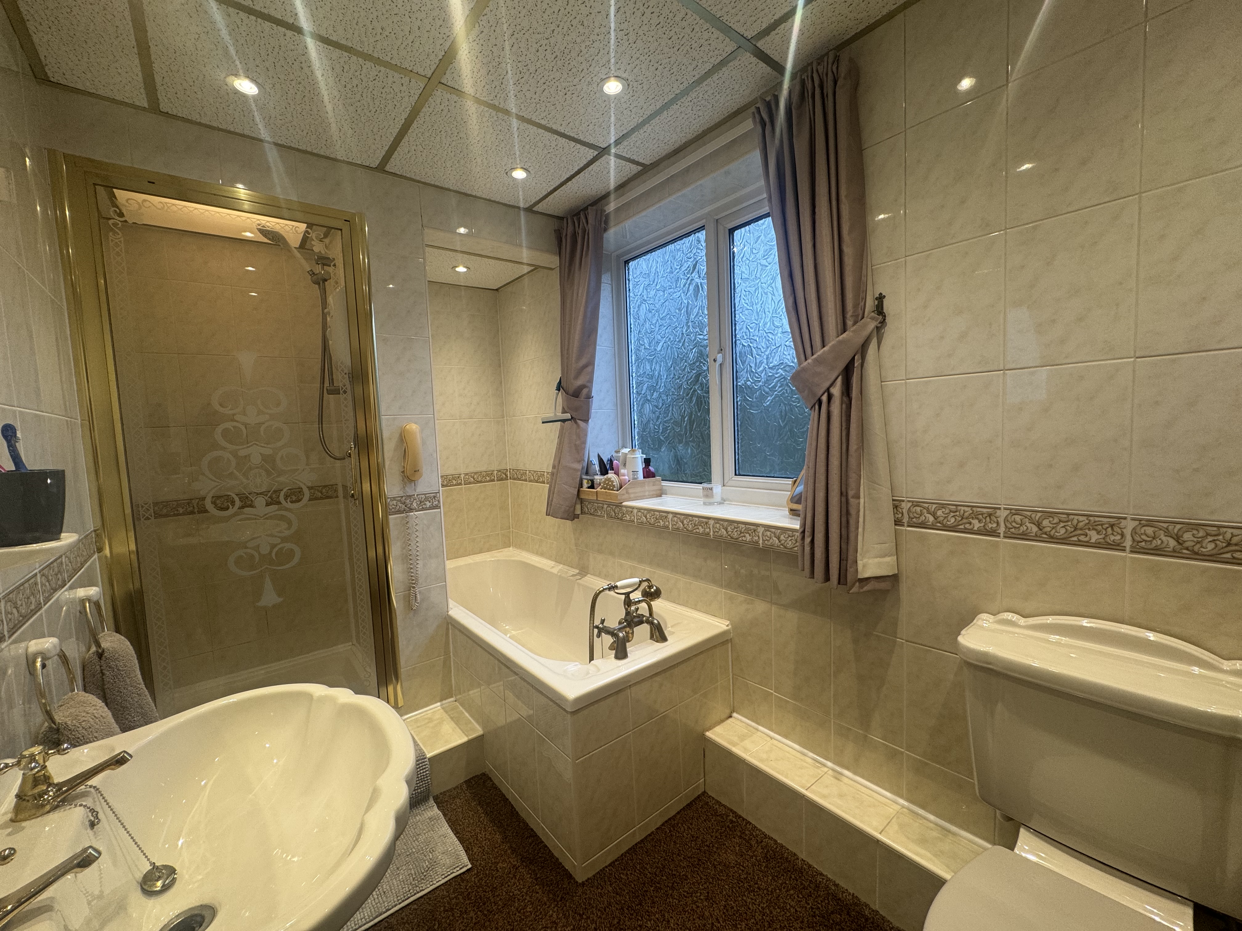 Family bathroom fitted with a low level WC, hand wash basin, bath and shower. Frosted window to the rear elevation.