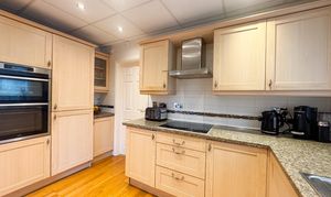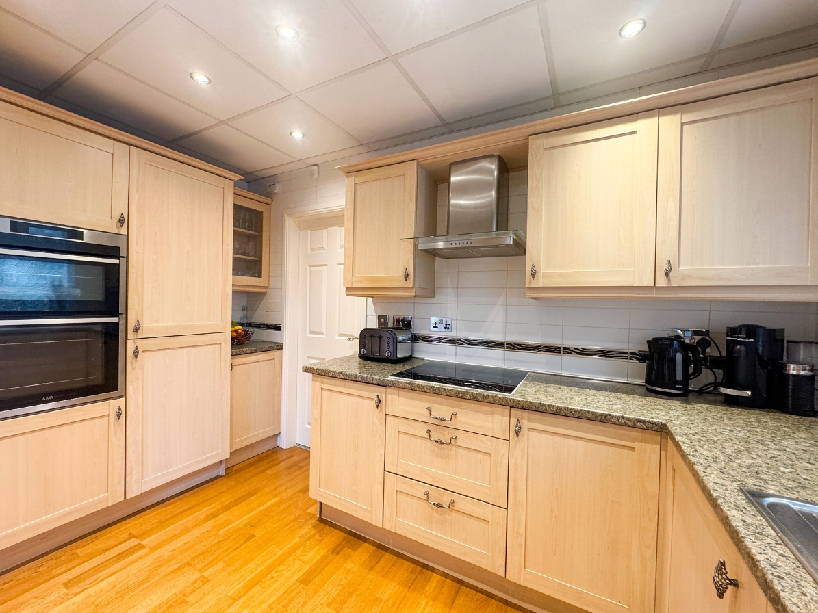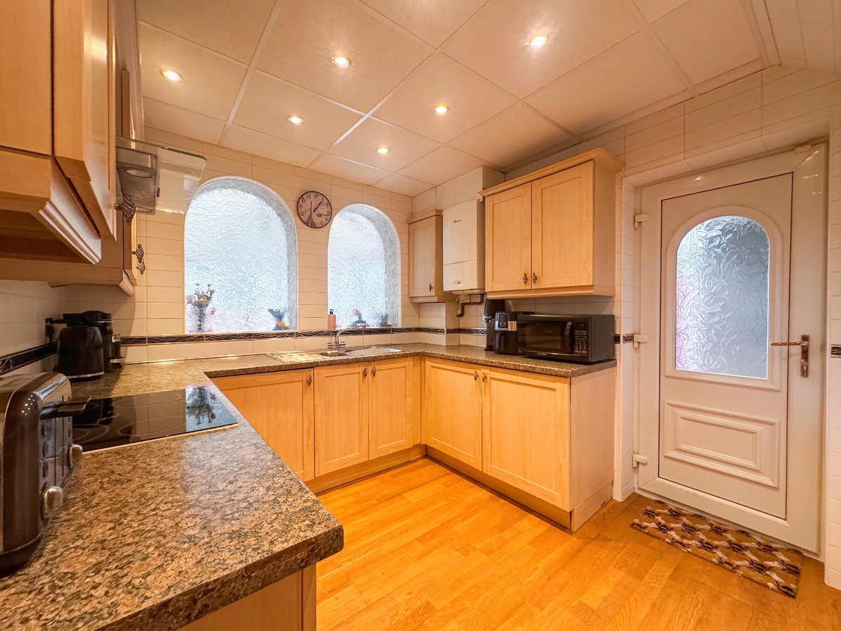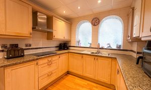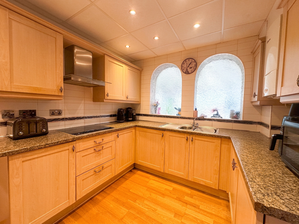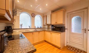 Featuring two arched internal windows overlooking the conservatory, the kitchen is fitted with a sink and double oven, along with a range of wall and base storage units. A door provides access to the side of the property.