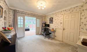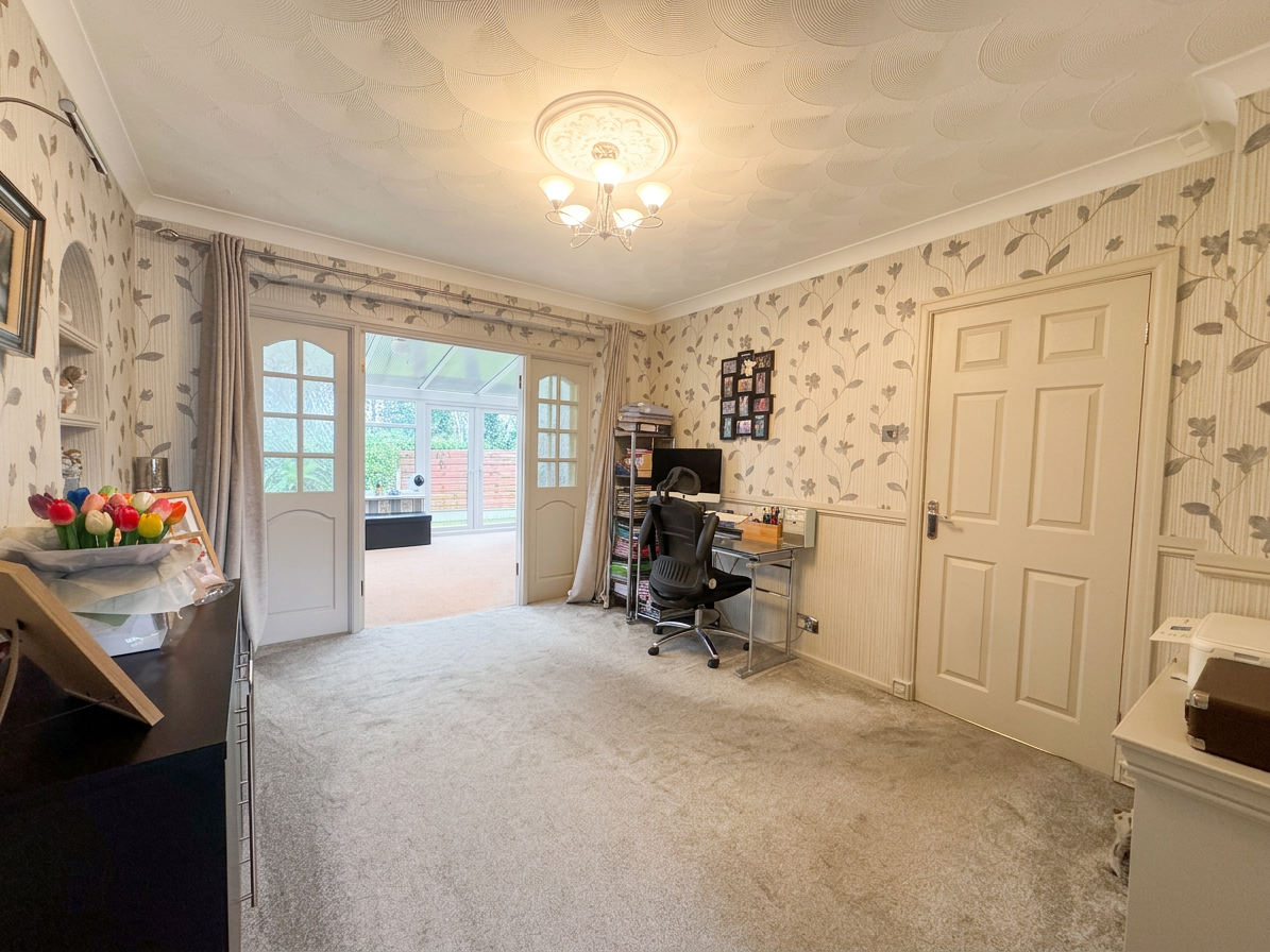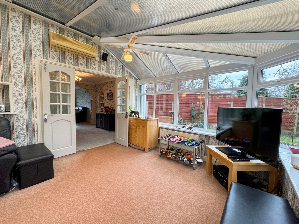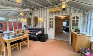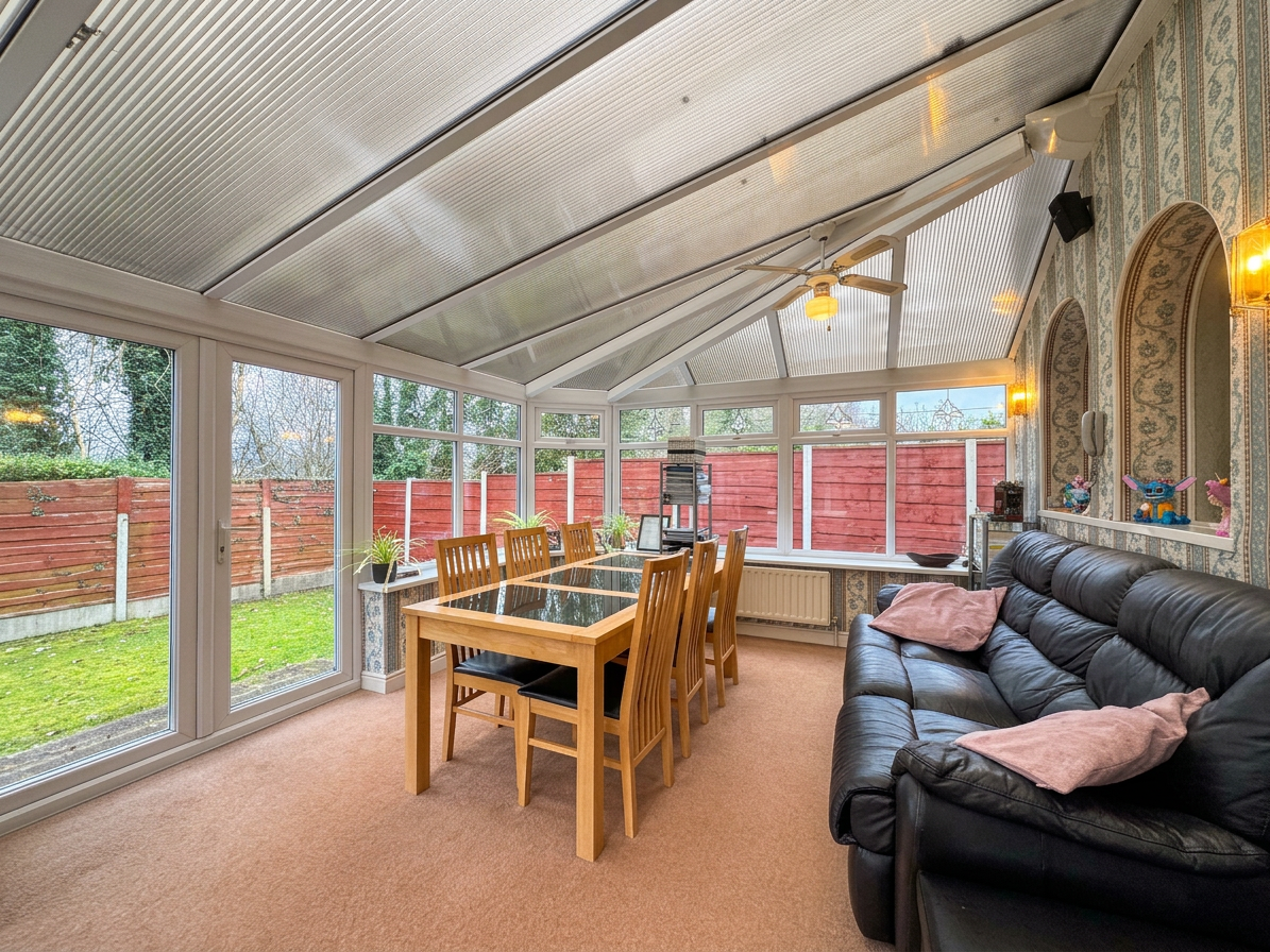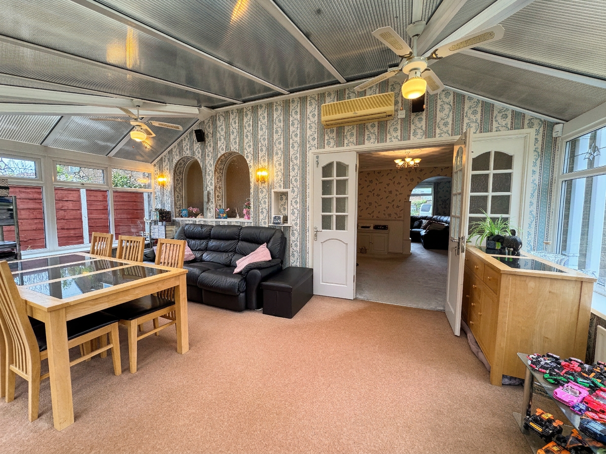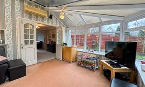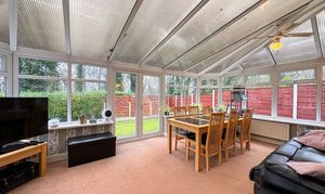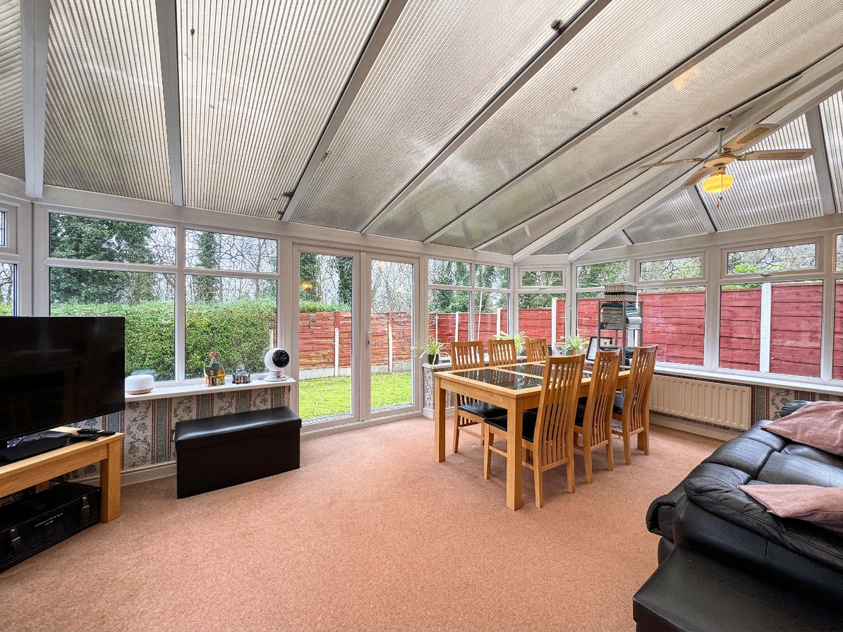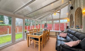 Bright conservatory featuring a glazed roof and surrounding windows allowing for plenty of natural light. Offering ample space for both dining and seating, with double doors providing access to the rear garden.