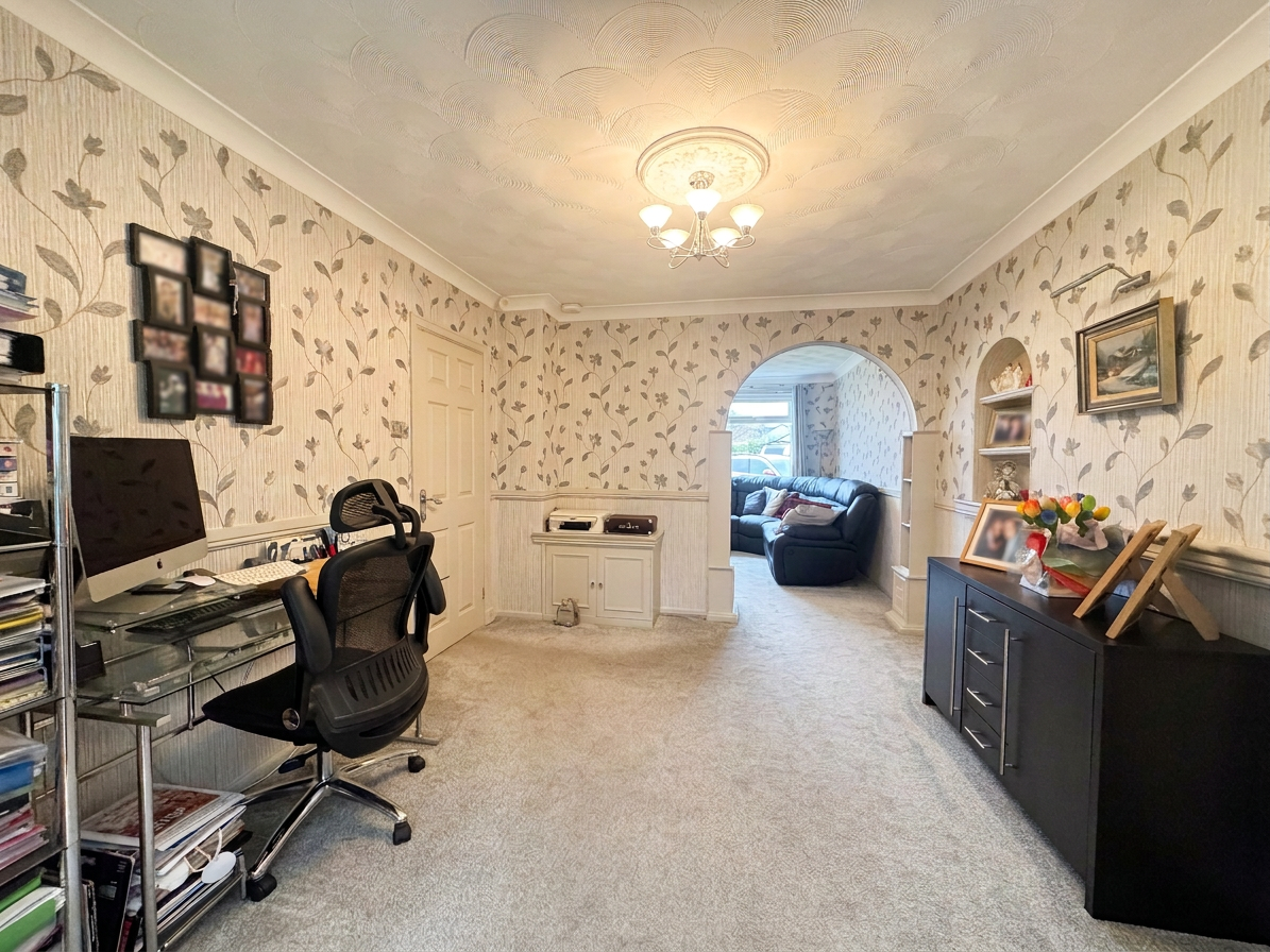 Window to the front elevation, TV point, and a feature electric fireplace. An open arch leads through to: