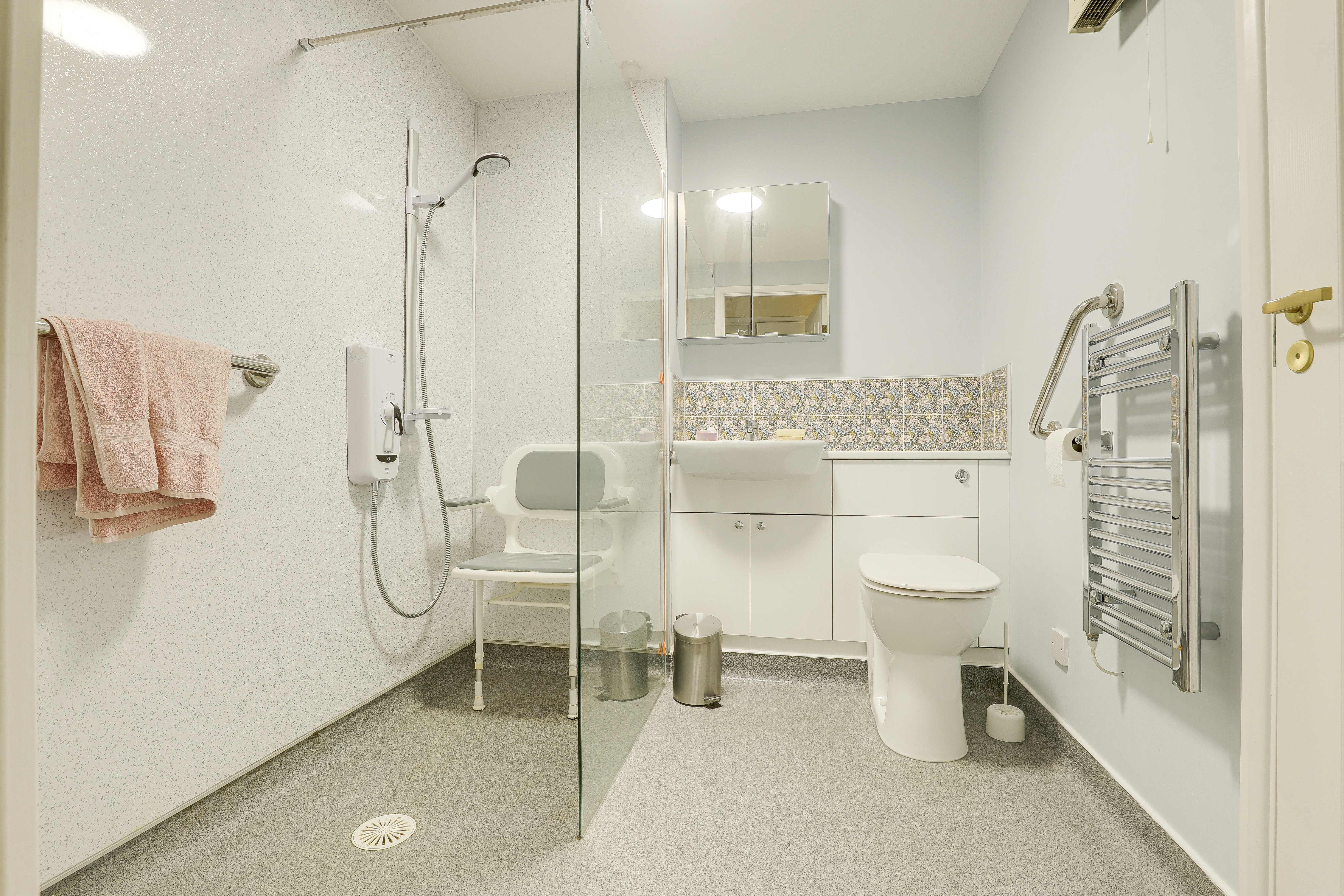 The shower room has a concealed flush W/C, a vanity-style wash basin, a walk-in shower with a wall-mounted electric shower, a chrome heated towel rail, a wall-mounted heater, a chrome heated towel rail, waterproof boarding to the walls, and vinyl flooring.