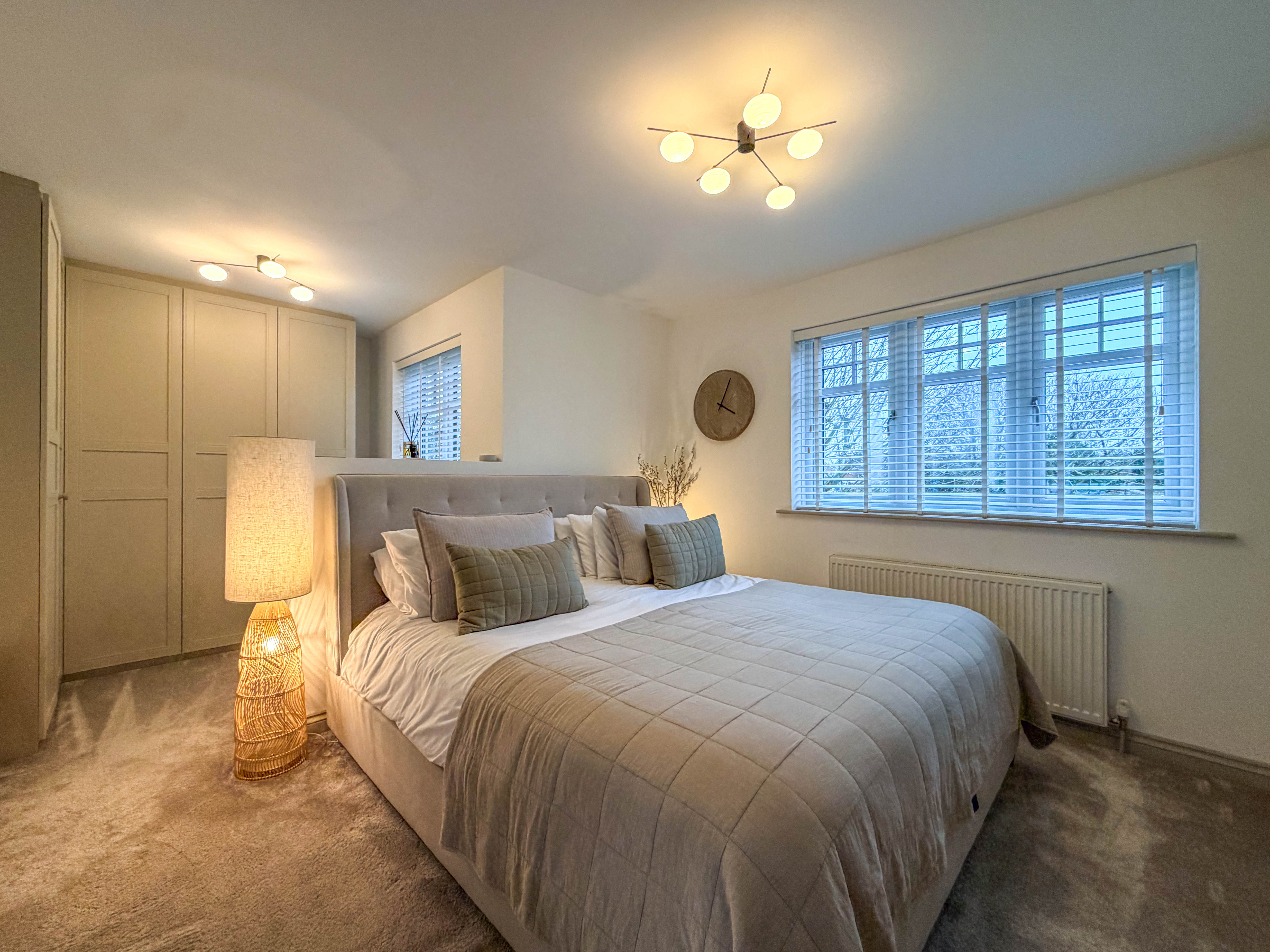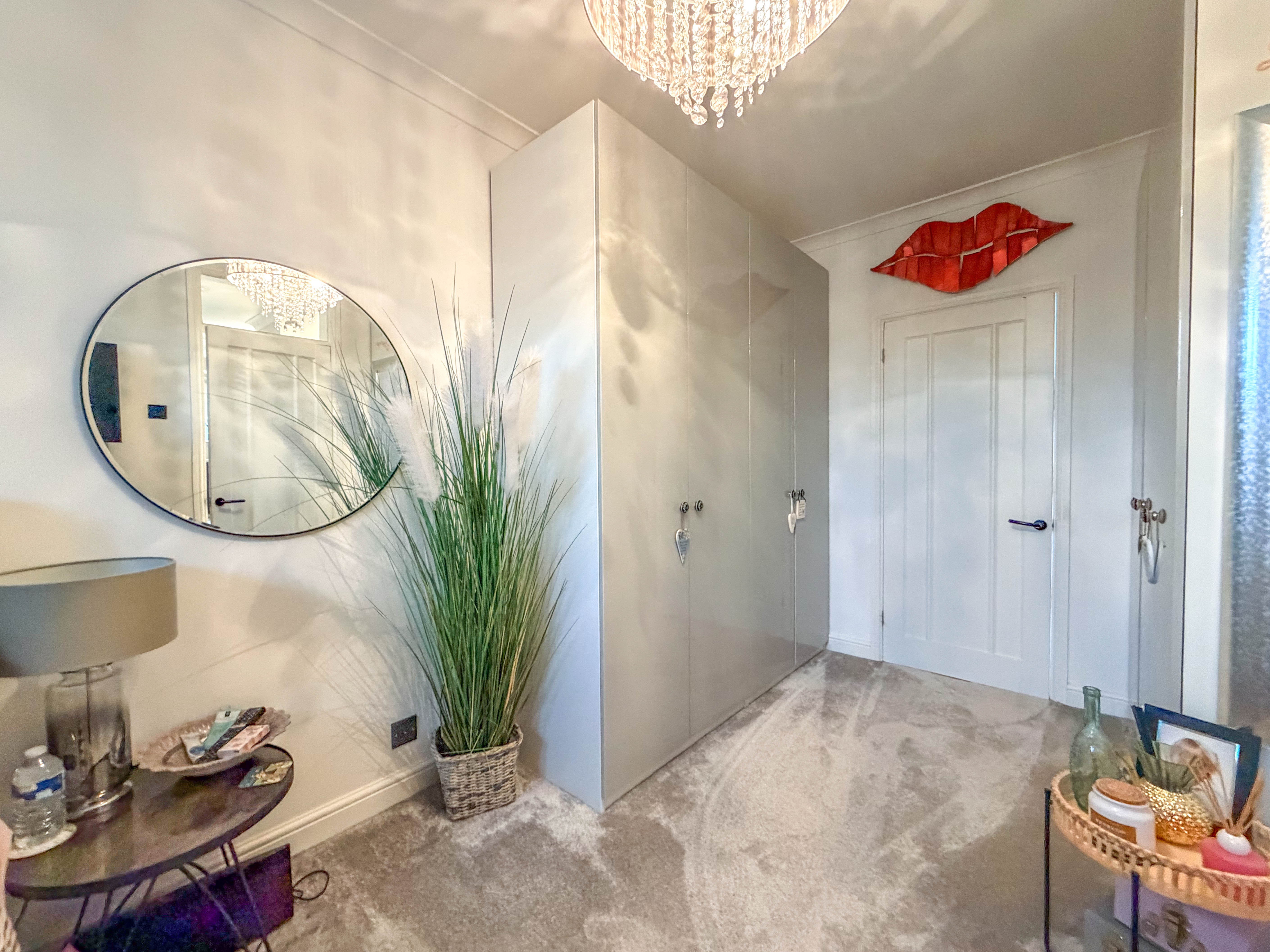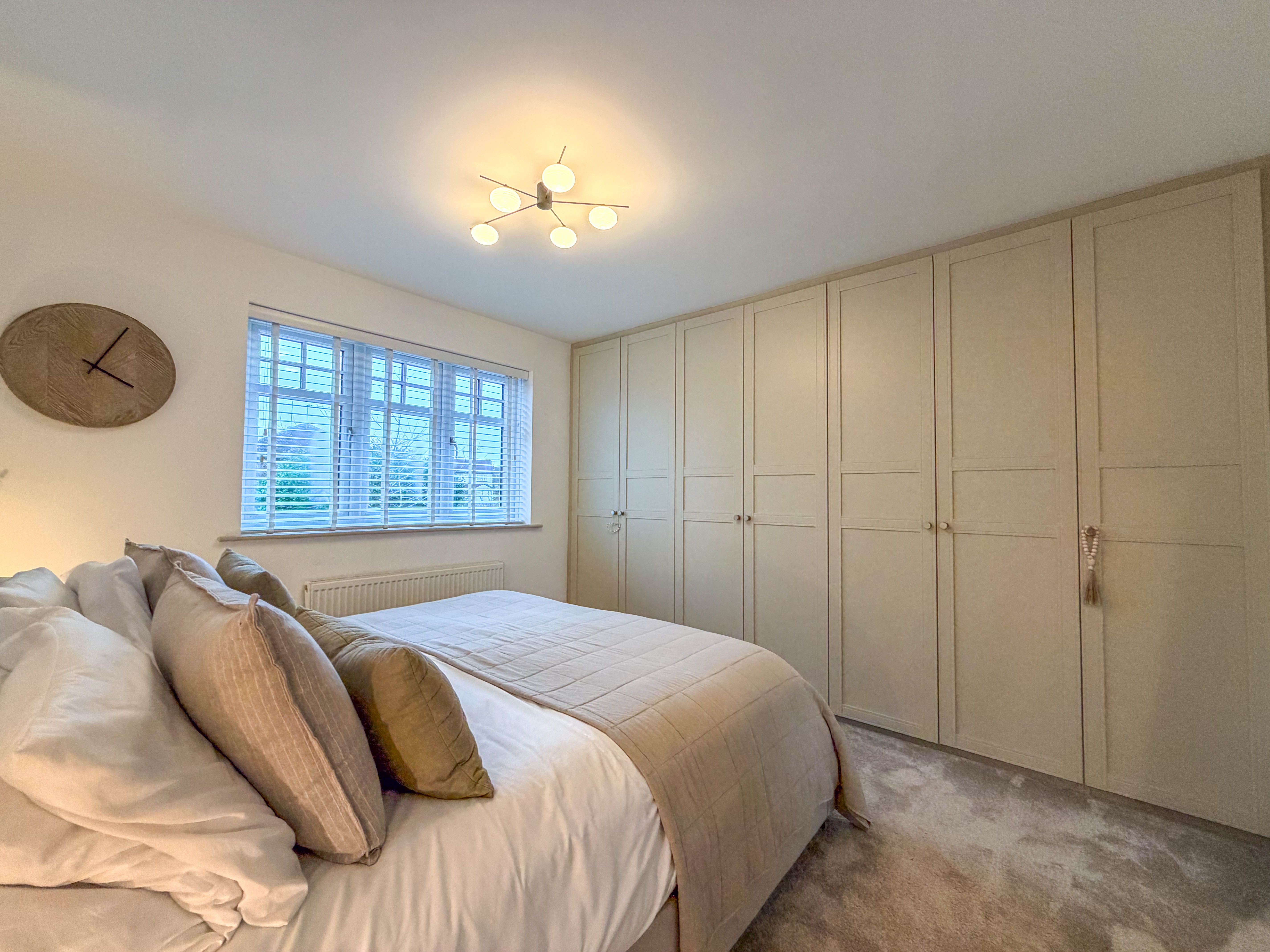 The first floor continues the theme of generous proportions, offering four excellent double bedrooms which provide comfortable accommodation for growing families or visiting guests. The principal bedroom benefits from an extensive range of built-in wardrobes, offering superb storage whilst maintaining a spacious and uncluttered feel. Another of the bedrooms enjoys the added luxury of its own en-suite shower room, creating a private retreat for guests or family members.