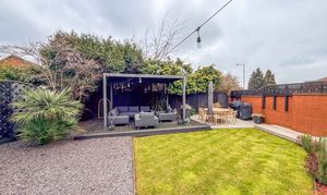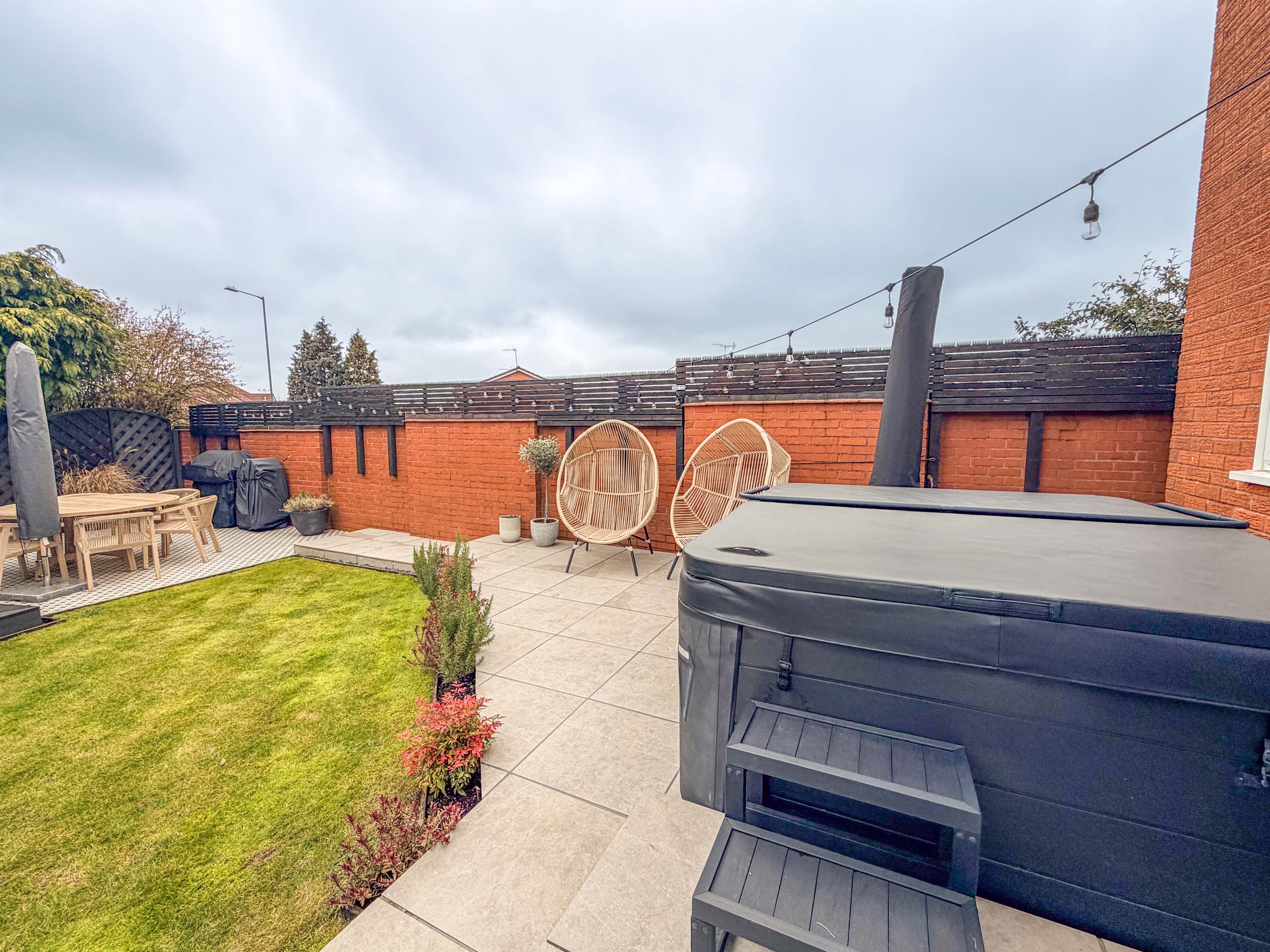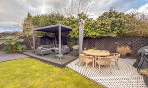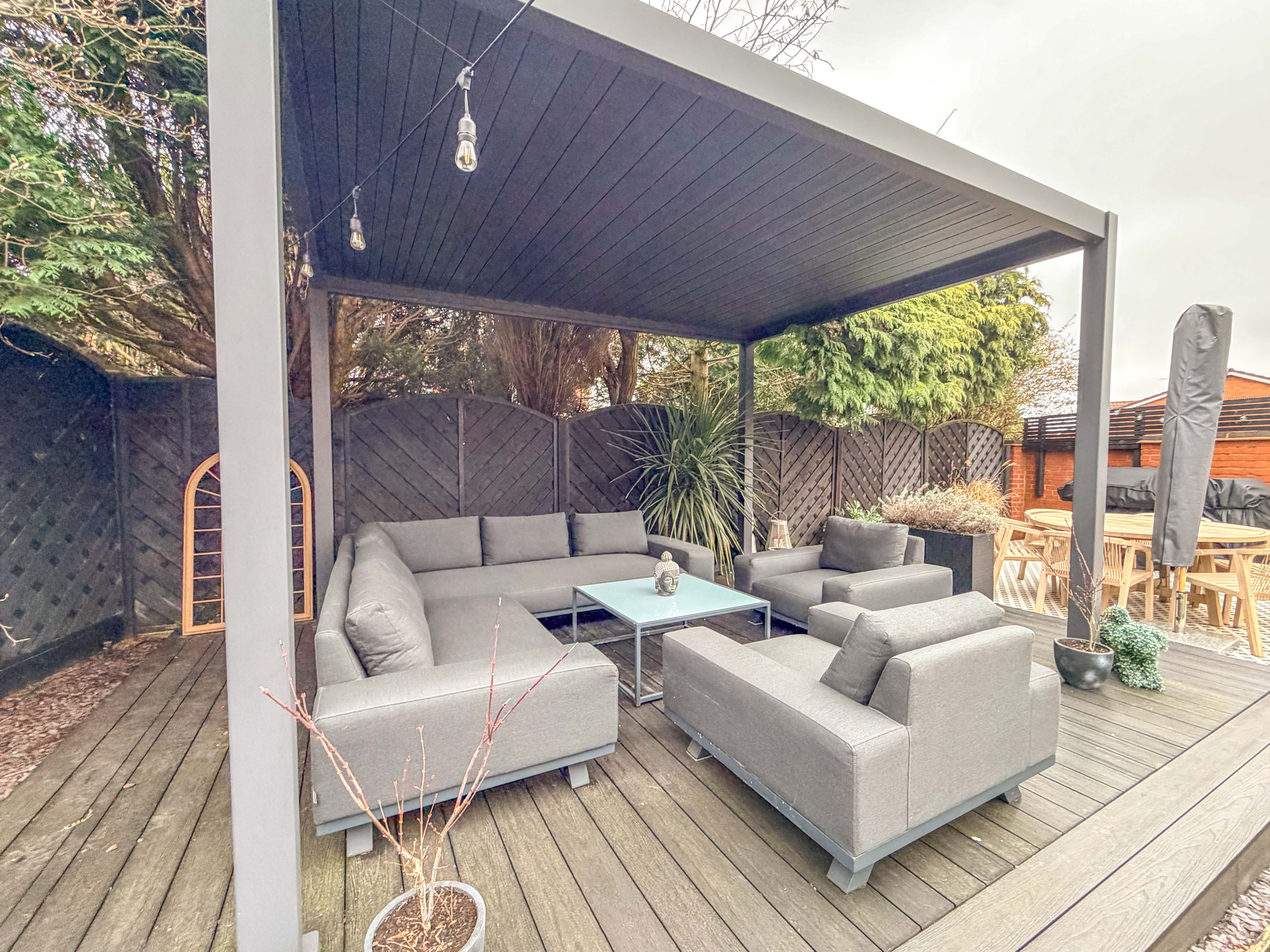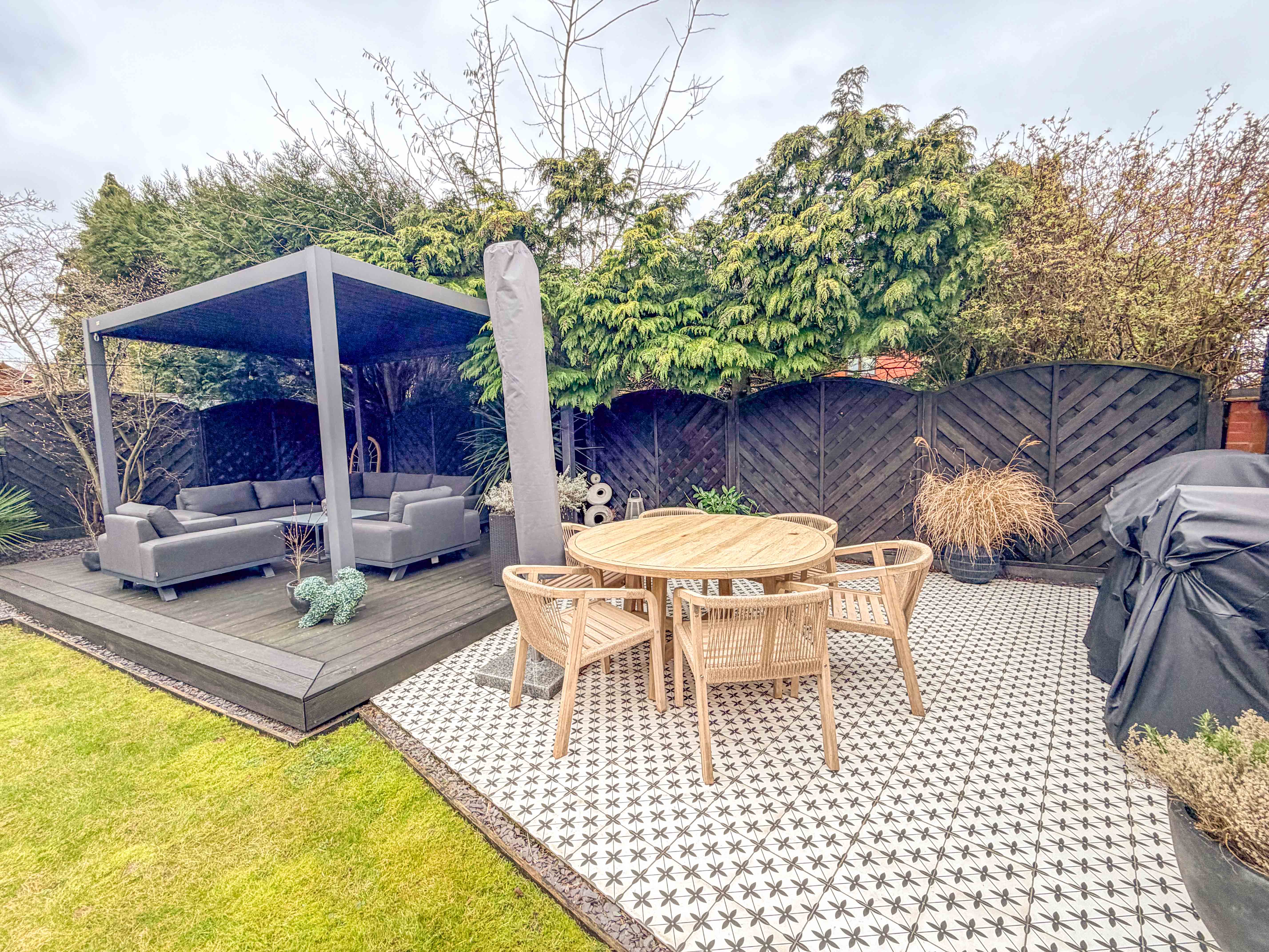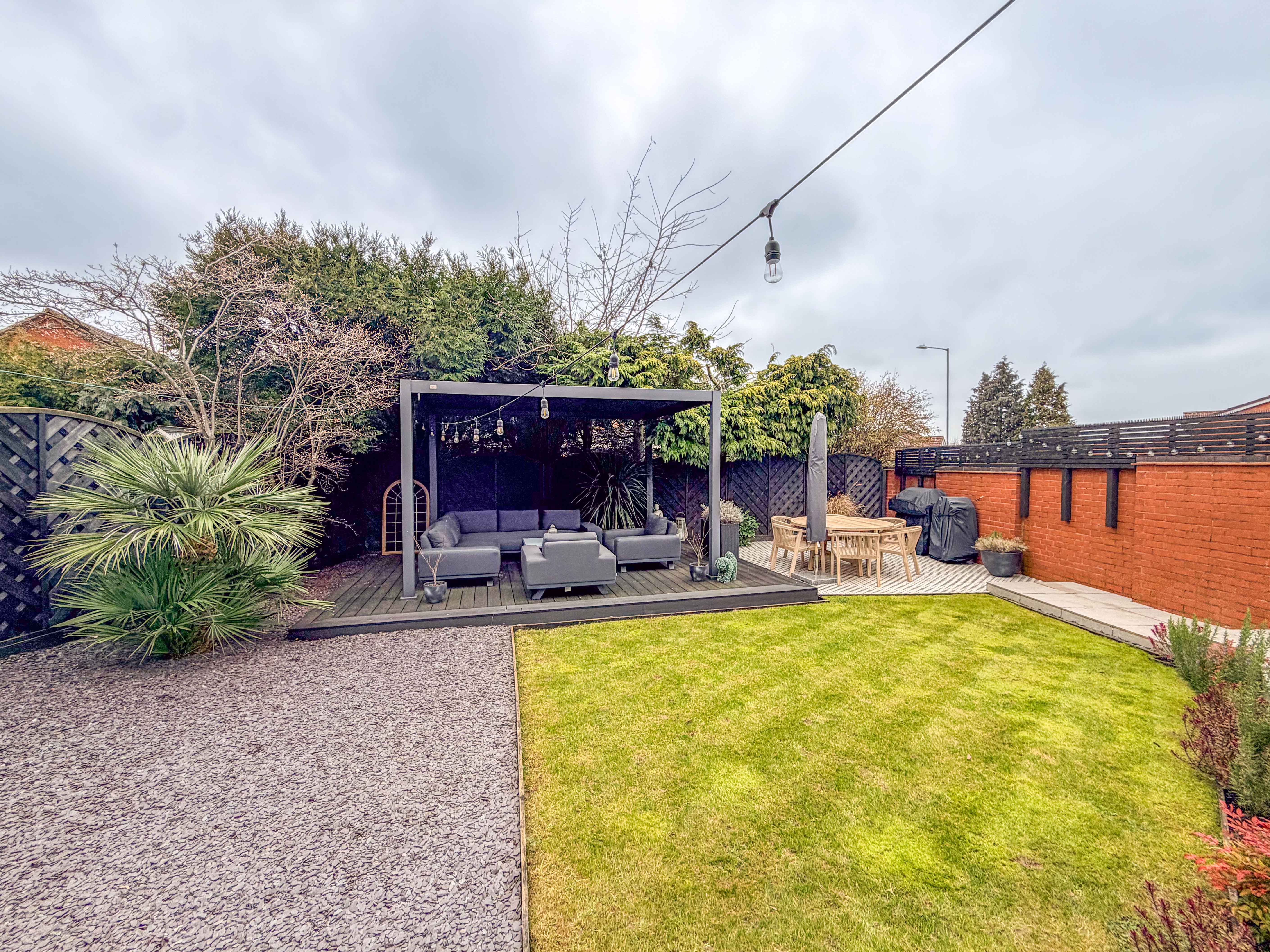Externally, the rear garden has been thoughtfully landscaped to create a superb outdoor environment that is both visually attractive and highly functional. The garden has been cleverly designed with a number of distinct entertaining zones, allowing it to be enjoyed in a variety of ways. These include a raised decked seating area ideal for relaxing with a morning coffee, a stylish tiled terrace, a spacious paved patio perfect for outdoor dining and summer barbecues, and a contemporary crushed slate feature area which adds texture and visual interest to the space. These areas are all beautifully complemented by a well-maintained lawn, providing a balance of greenery and usable outdoor living space.
