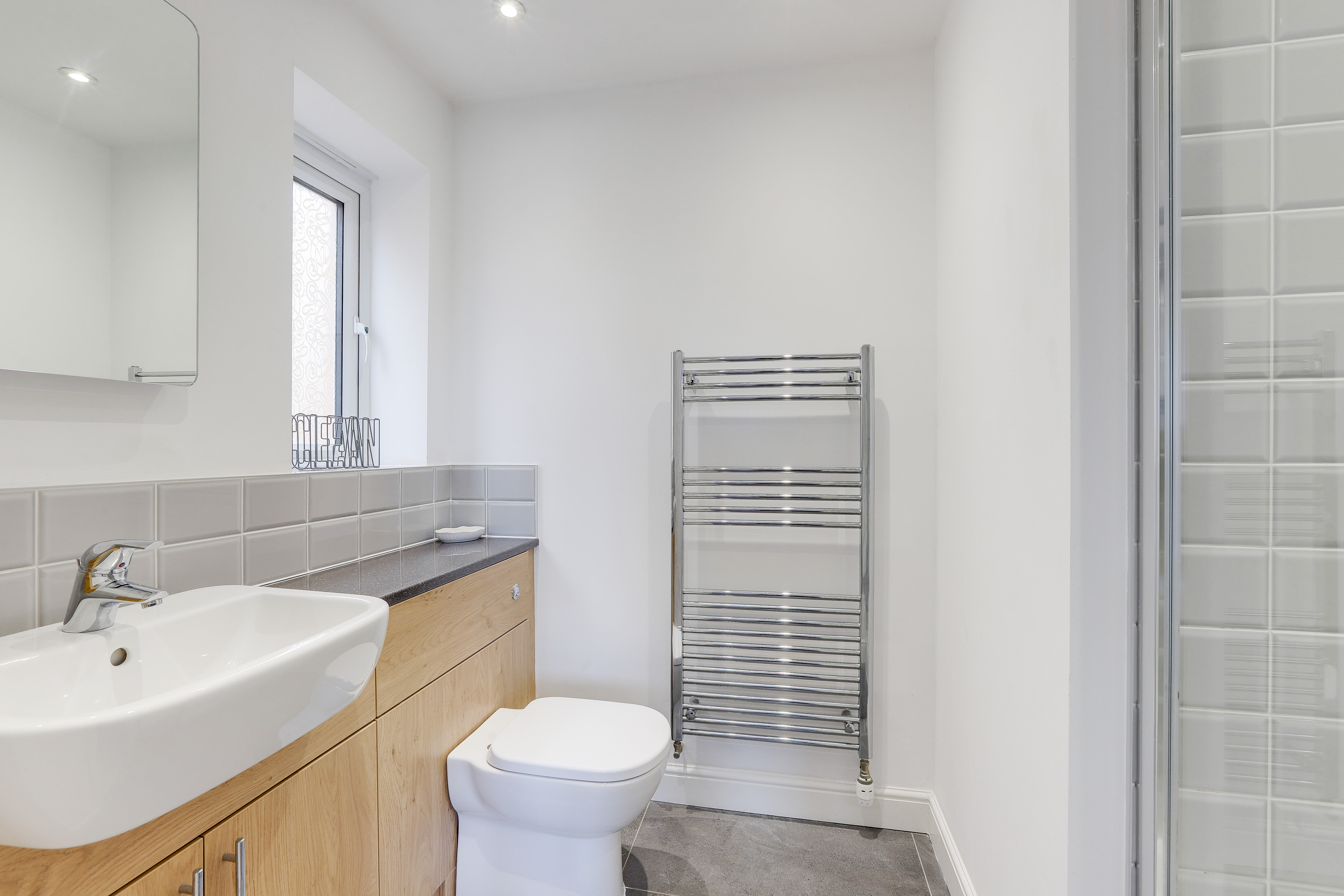 The en-suite has a low level flush W/C, a sunken wash basin with a mixer tap, a shower enclosure with a wall-mounted handheld shower fixture, tiled flooring, partially tiled walls, a chrome heated towel rail, recessed spotlights, and a UPVC double-glazed obscure window to the rear elevation.
