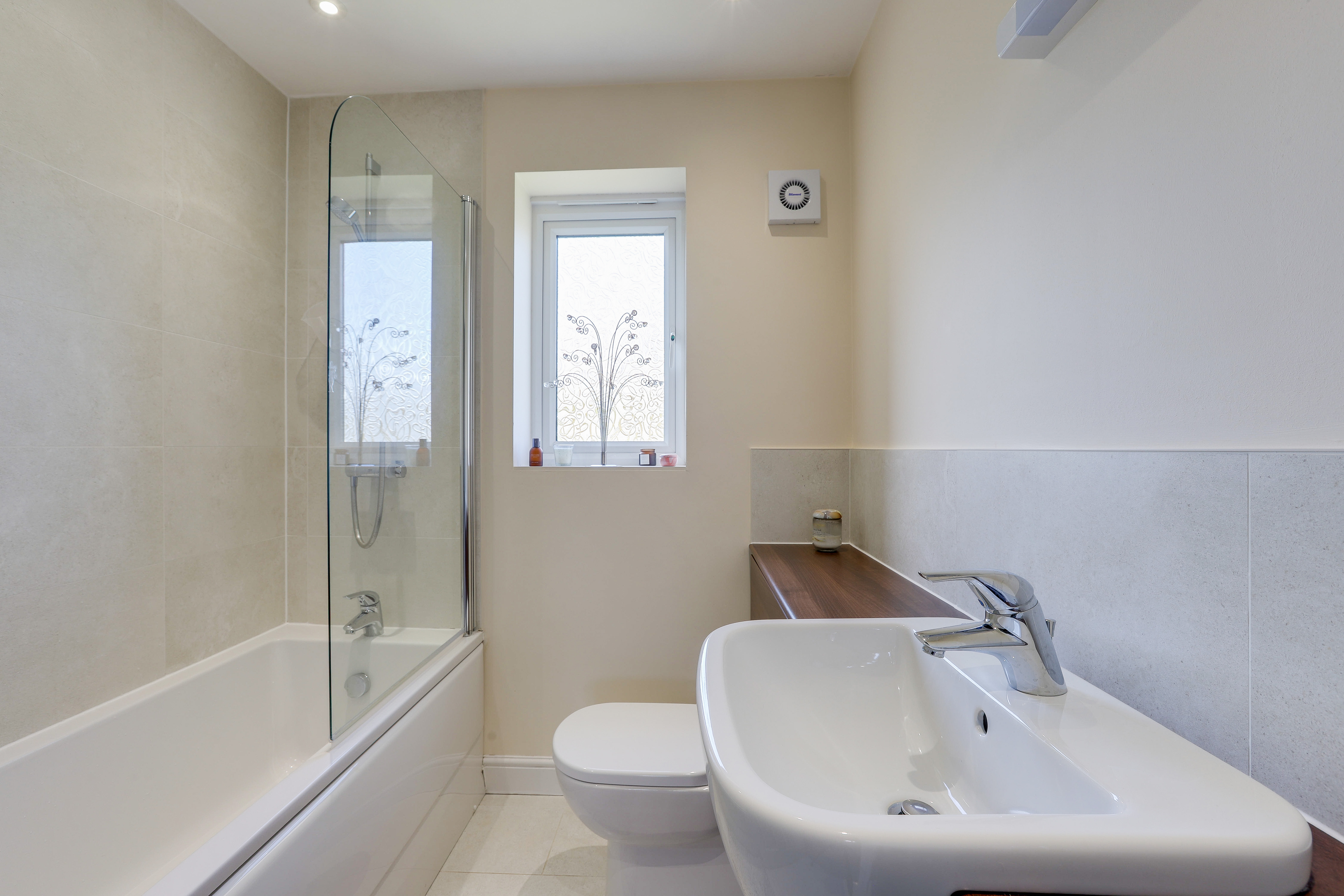 The bathroom has a low level flush W/C, a sunken style wash basin with a mixer tap, a panelled bath with a wall-mounted handheld shower fixture and glass shower screen, tiled flooring, partially tiled walls, a chrome heated towel rail, recessed spotlights, an extractor fan, and a UPVC double-glazed obscure window to the rear elevation.