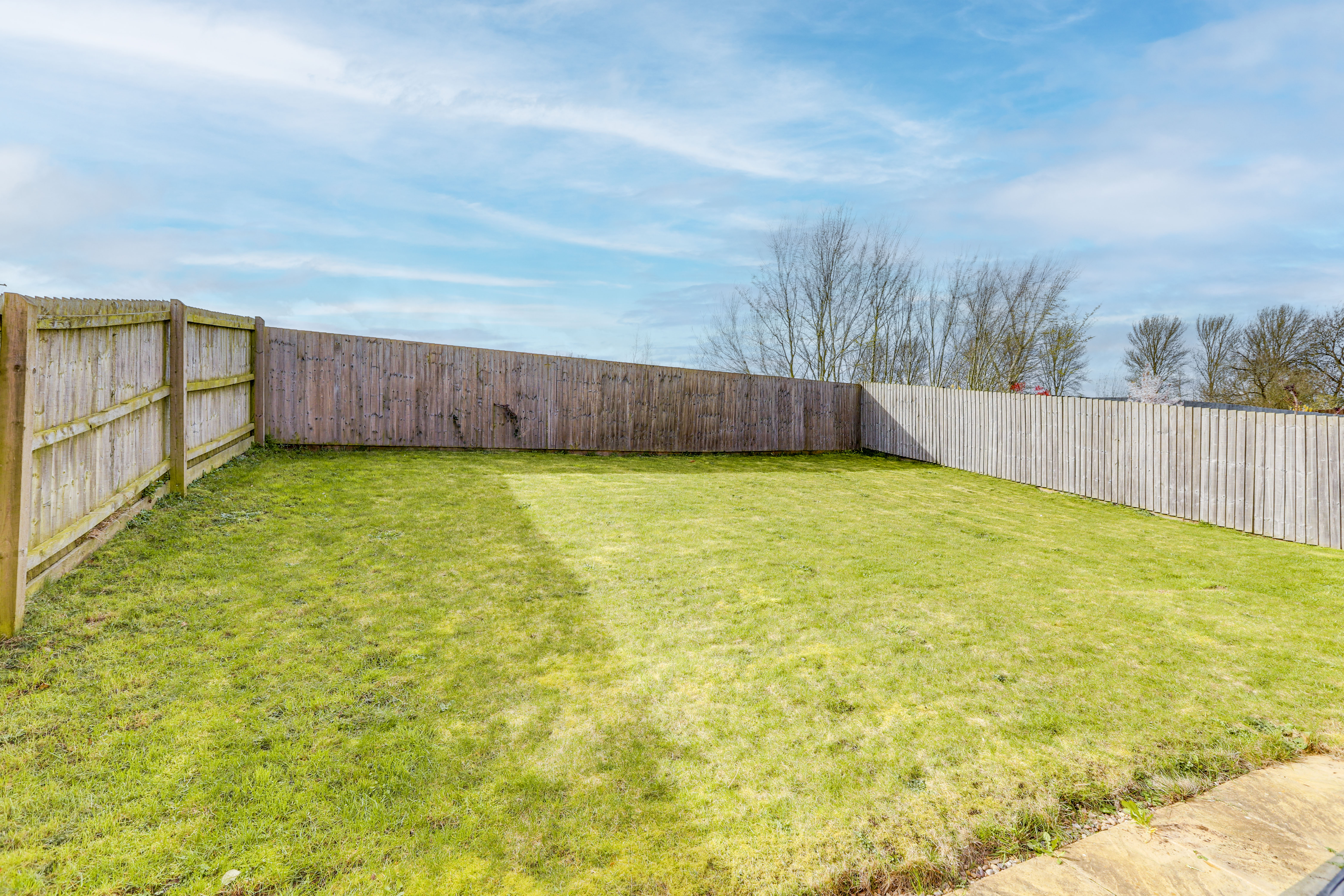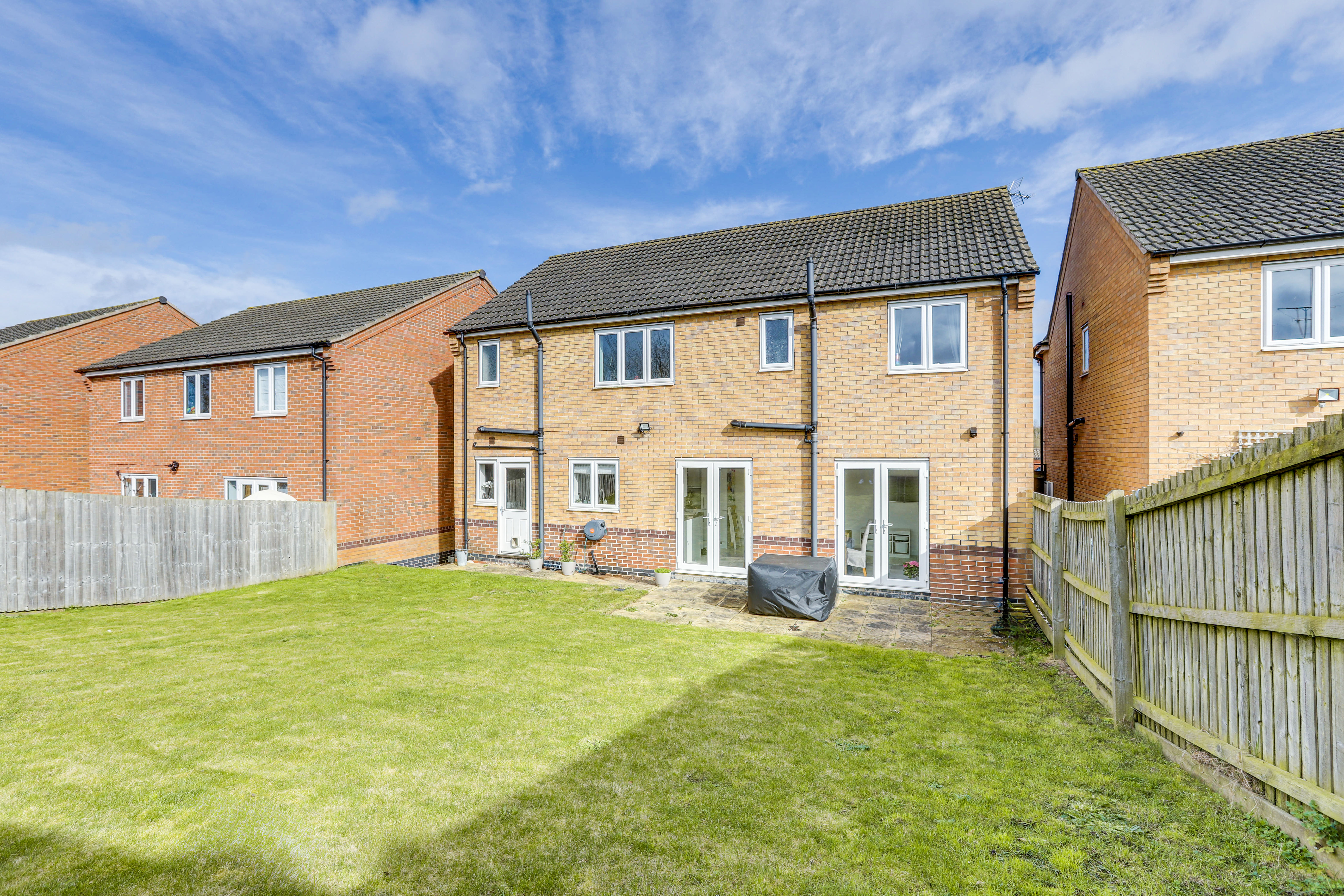 To the rear is a private enclosed garden with a paved patio seating area, a lawn, an outdoor tap, and fence panelled boundaries.