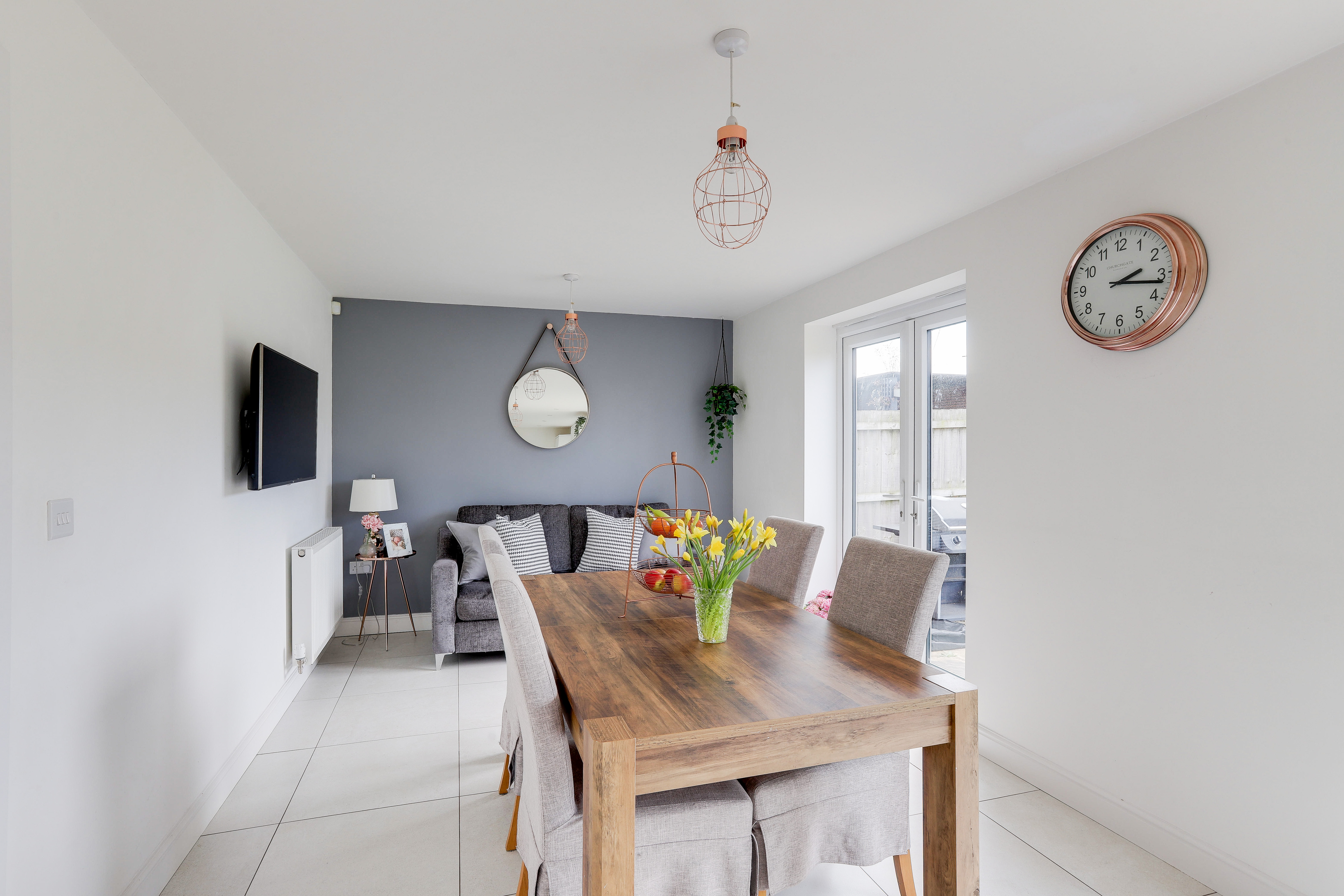 The kitchen/diner has a range of fitted base and wall units with wood-effect worktops, a ceramic sink and a half with a movable swan neck mixer tap and drainer, an integrated double oven, an integrated five-ring gas hob with a stainless steel extractor fan, an integrated dishwasher, an integrated fridge freezer, tiled flooring, partially tiled walls, two radiators, a UPVC double-glazed window to the front elevation, recessed spotlights, and two sets of double French doors leading out to the rear garden.