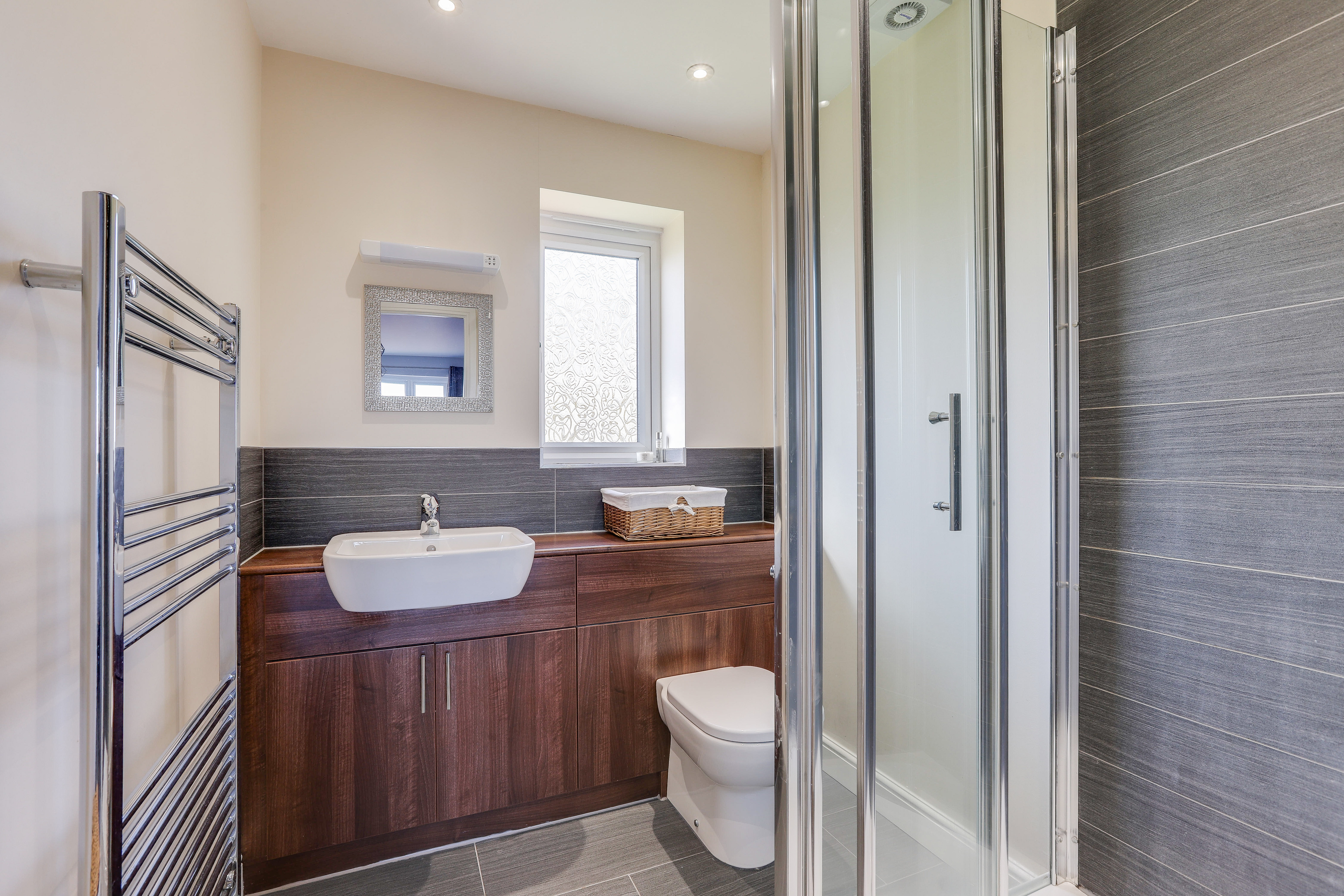 The en-suite has a low level flush W/C, a sunken wash basin with a mixer tap, a shower enclosure with a wall-mounted handheld shower fixture, tiled flooring, partially tiled walls, a chrome heated towel rail, recessed spotlights, and a UPVC double-glazed obscure window to the side elevation.