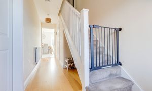The entrance hall has wood-effect flooring, carpeted stairs, a radiator, a UPVC double-glazed window to the front elevation, and a single composite door providing access into the accommodation.