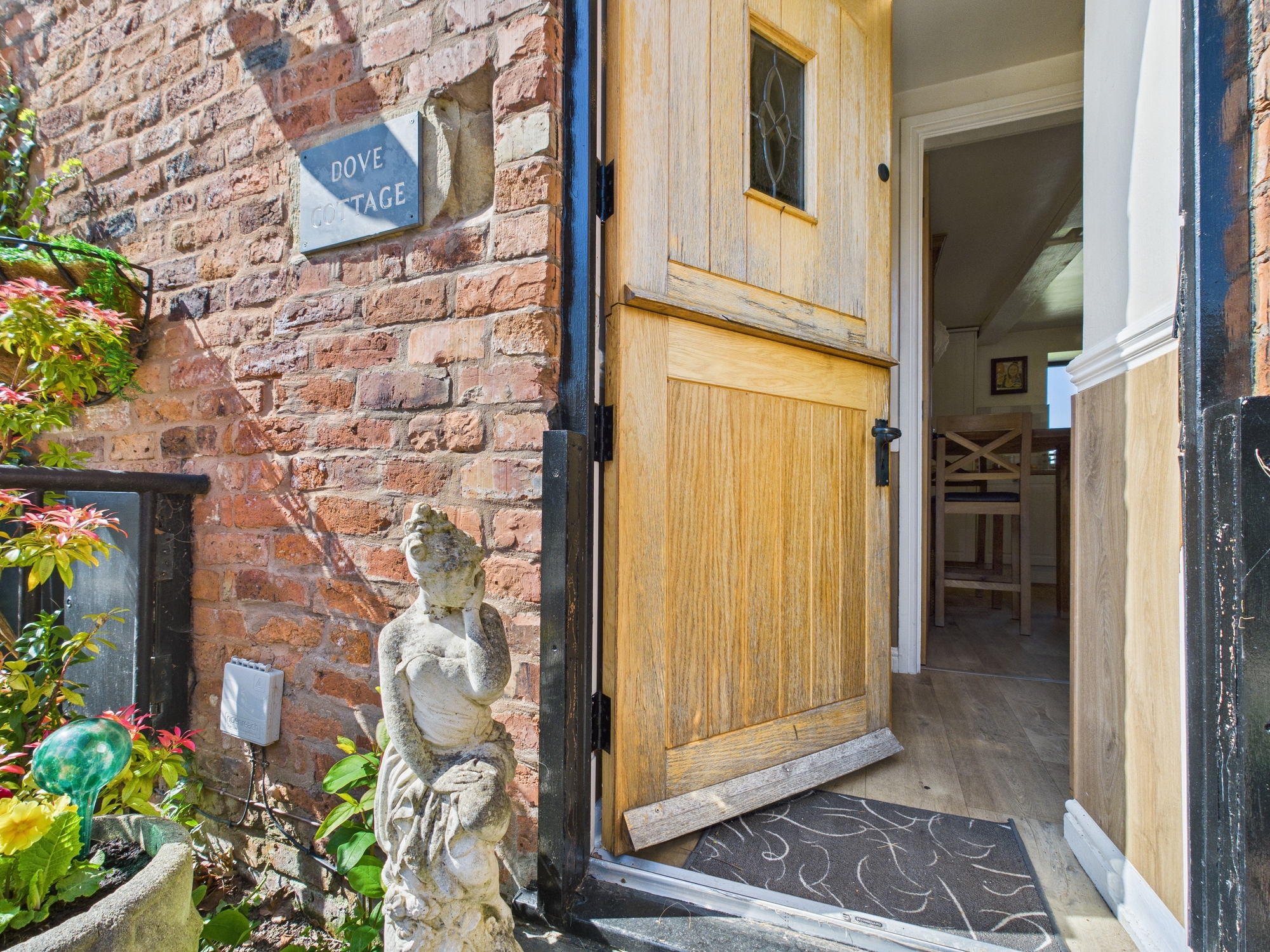 Dove Cottage is approached via a gravelled communal courtyard. The front offers a pleasant garden space, perfect for relaxing with morning coffee. To the rear lies a shaped garden bordering open fields, featuring an Indian stone patio where one can enjoy superb countryside views. The property benefits from two allocated parking spaces positioned just a short walk across the courtyard.