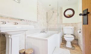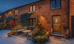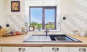 This charming barn conversion offers character-filled living surrounded by open countryside. Dove Cottage features a spacious beamed living room with attractive tiling that opens to a dining conservatory with countryside views, complete with a multi-fuel log burner and air conditioning. The modern kitchen boasts cream "Shaker" style units with curved metallic fitments. Upstairs, two double bedrooms include a main bedroom with stunning A-frame exposed beams and vaulted ceilings. The bathroom contains a three-piece white suite with tiled walls above the sanitary ware.