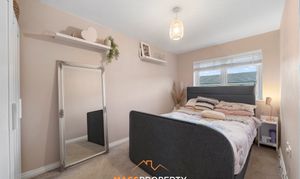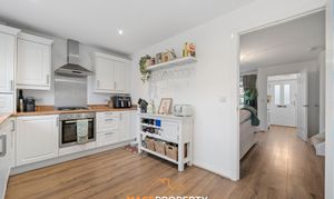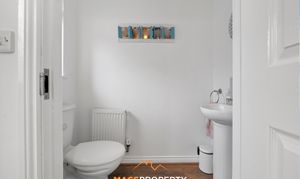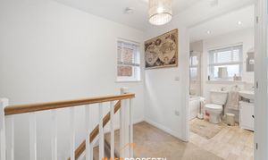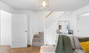 The ground floor features a warm and welcoming front lounge, ideal for unwinding. To the rear sits a bright and spacious open-plan kitchen and dining area, complete with integrated fridge freezer and dishwasher. Patio doors flood the room with natural light, creating a bright and airy setting. A convenient downstairs WC completes the ground floor layout.