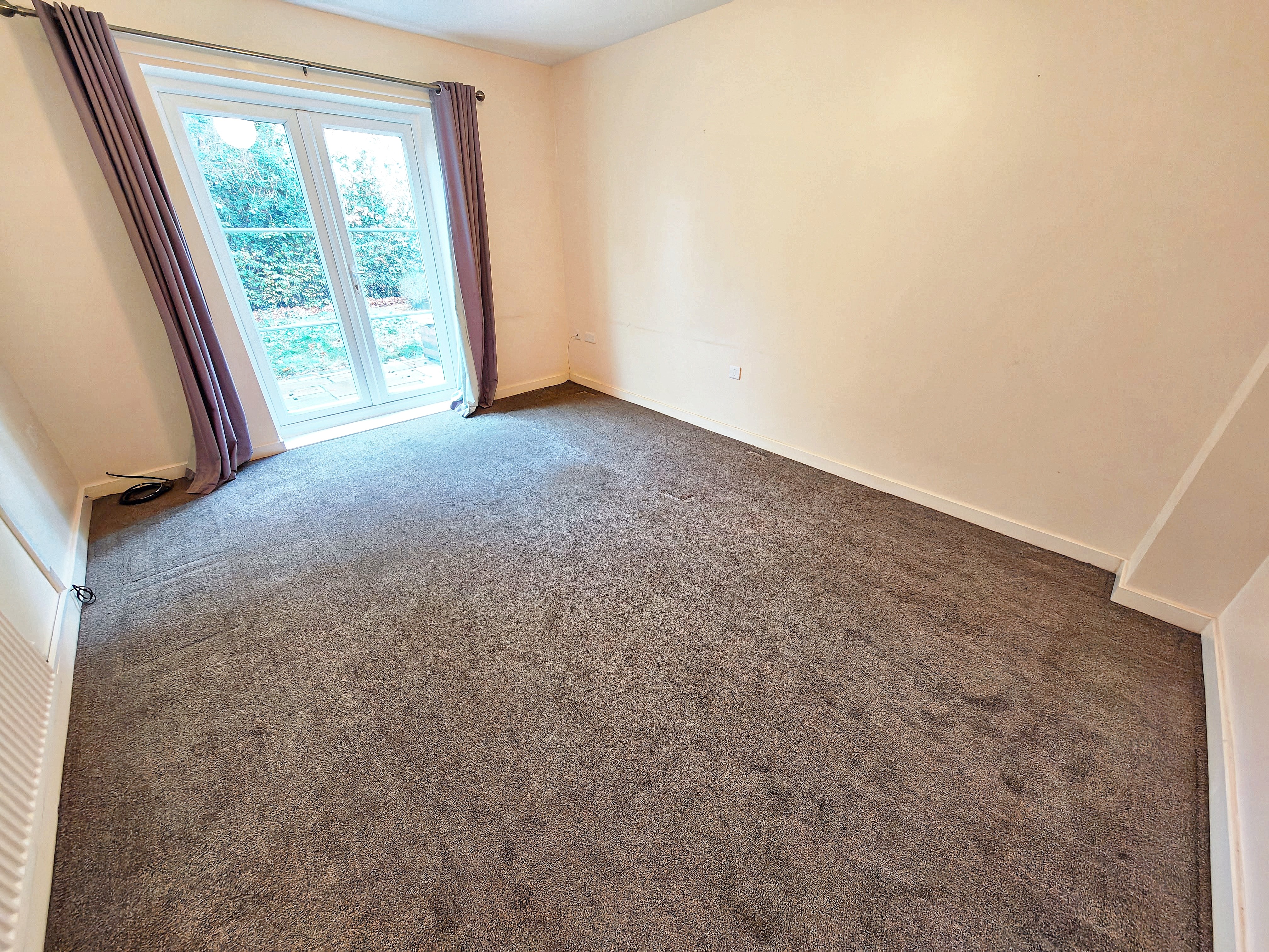 The living room is spacious, featuring French doors that lead directly to the garden.