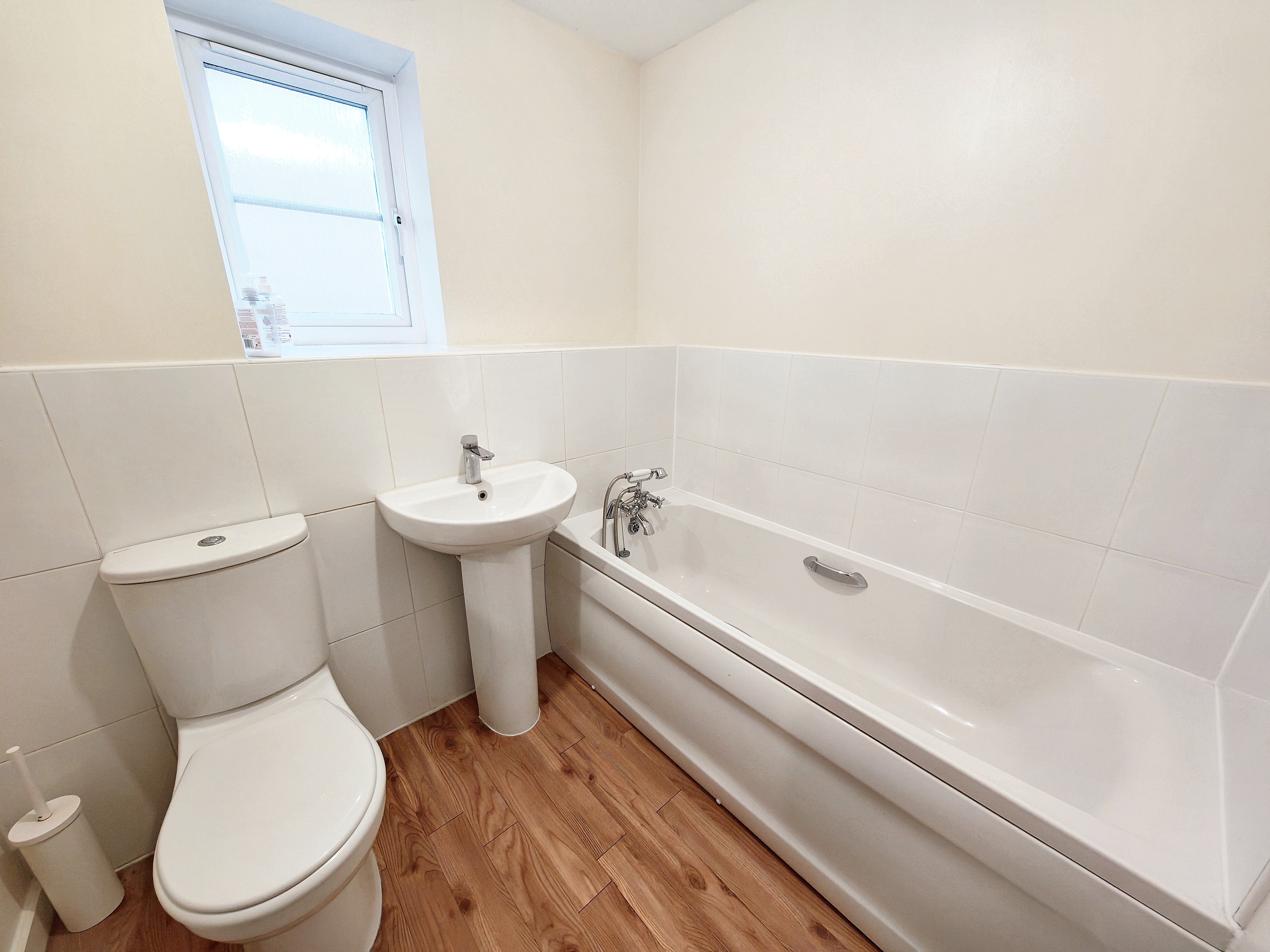 The bathroom features a bath with an overhead shower, a WC, and a wash basin.