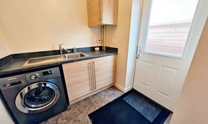 The utility room offers extra work surface space, a door leading to the garden, and plumbing for appliances.