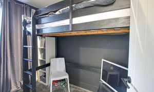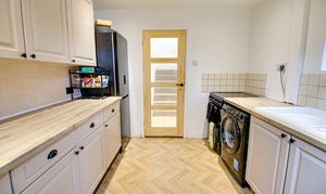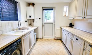 Side facing window, rear facing door, fitted range of base and wall units, wall mounted Worcester boiler fitted 2023.