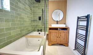 - Newly fitted bathroom suite with emerald green splash back tiling