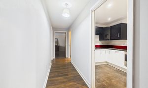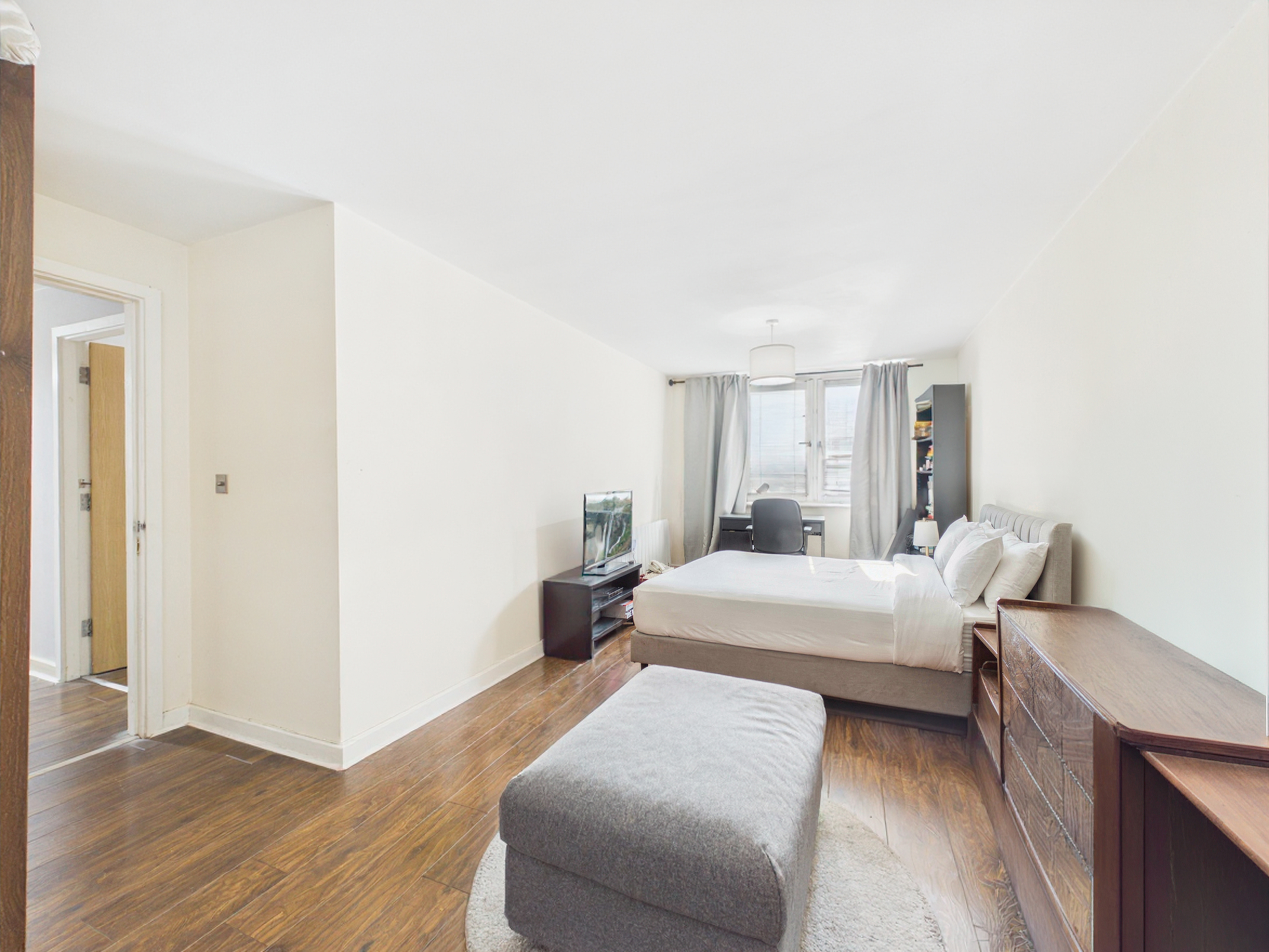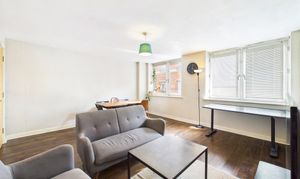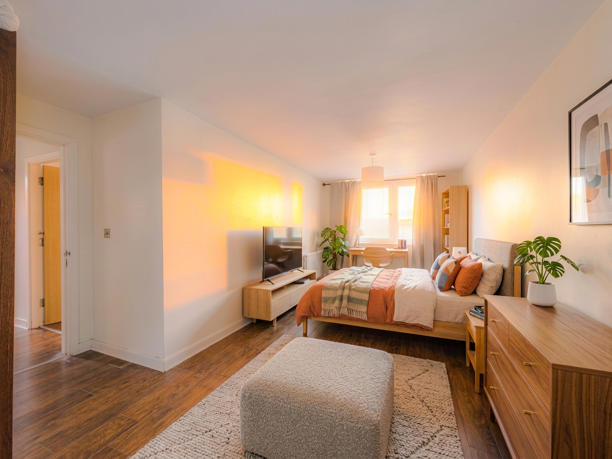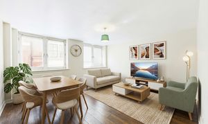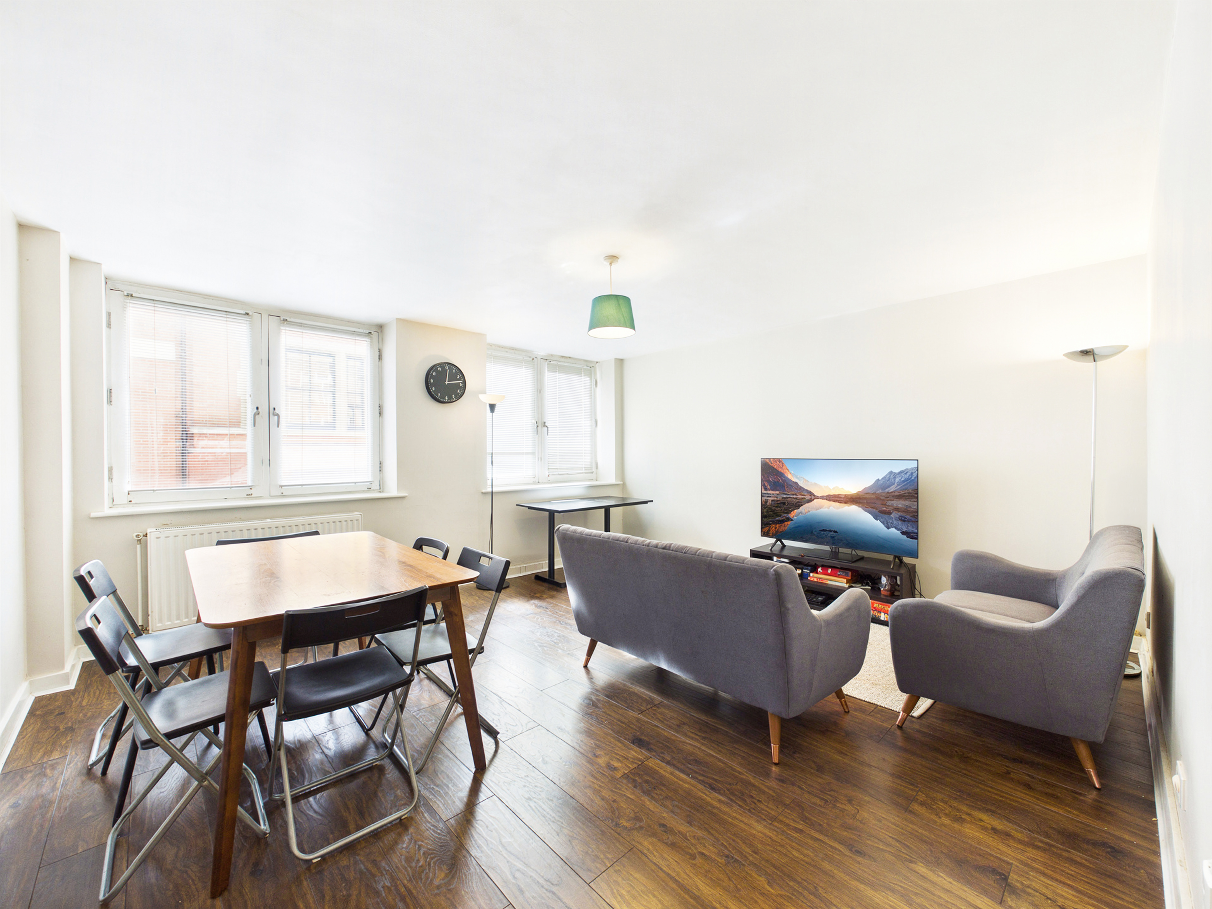The spacious apartment opens into a welcoming hallway featuring a substantial storage cupboard. Warm wood-effect laminate flooring runs seamlessly through the hallway, bedrooms and living area, establishing a cohesive and tidy aesthetic that is further enhanced by polished chrome sockets and switches throughout the home. At the heart of the apartment, the lounge/dining room serves as a naturally bright and comfortable focal point, with two large windows making the space feel airy and inviting.
