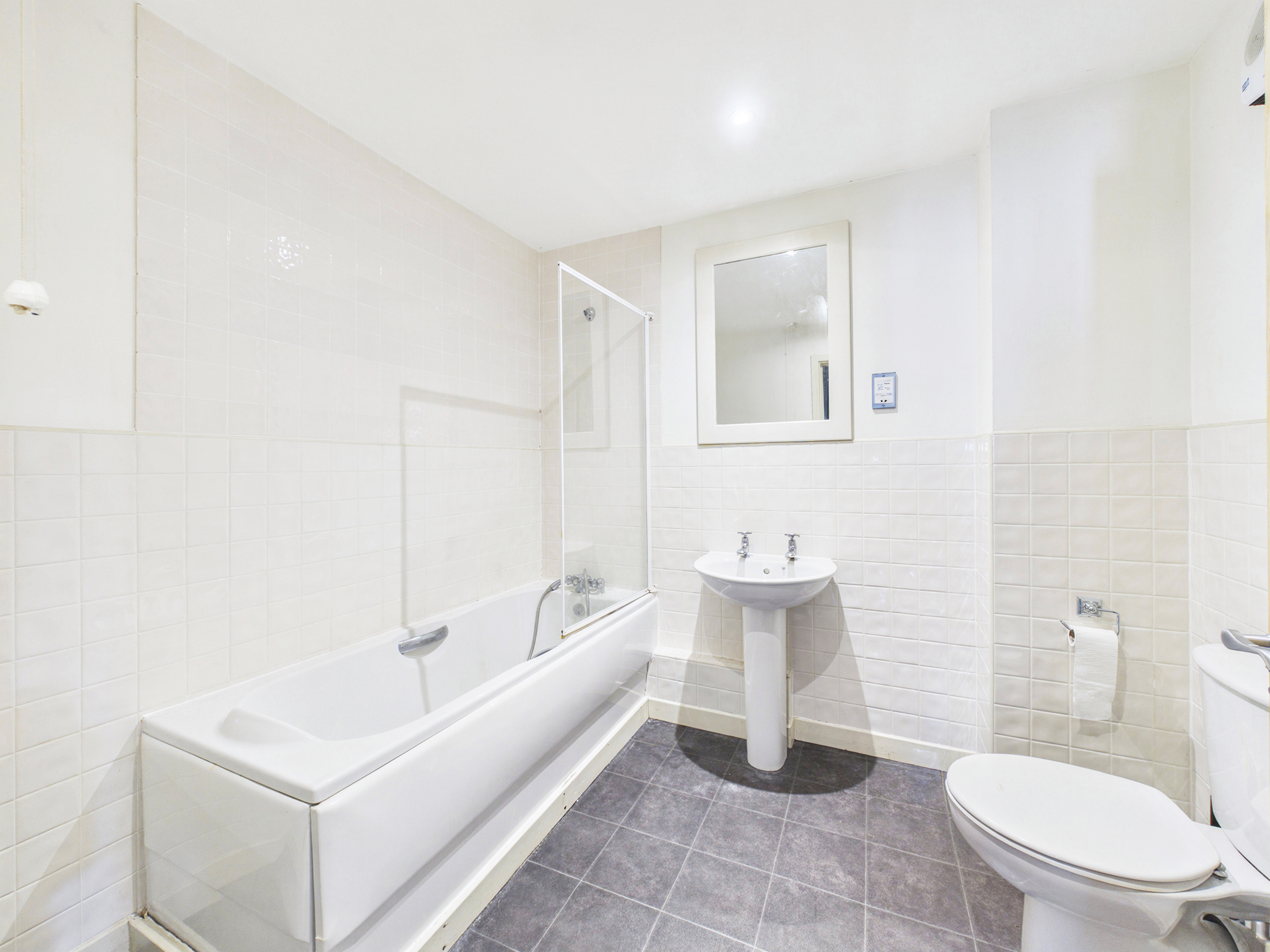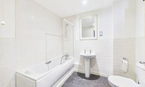 A contemporary main bathroom serves the rest of the apartment, providing a white three-piece suite that includes a bath with a bath/shower mixer tap, wash basin, and toilet, in addition to a heated towel rail. The bathroom is perfectly complemented by white tiles, also to half-wall height, alongside matching dark grey-stone effect flooring.