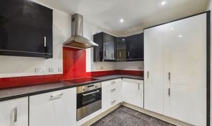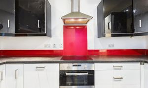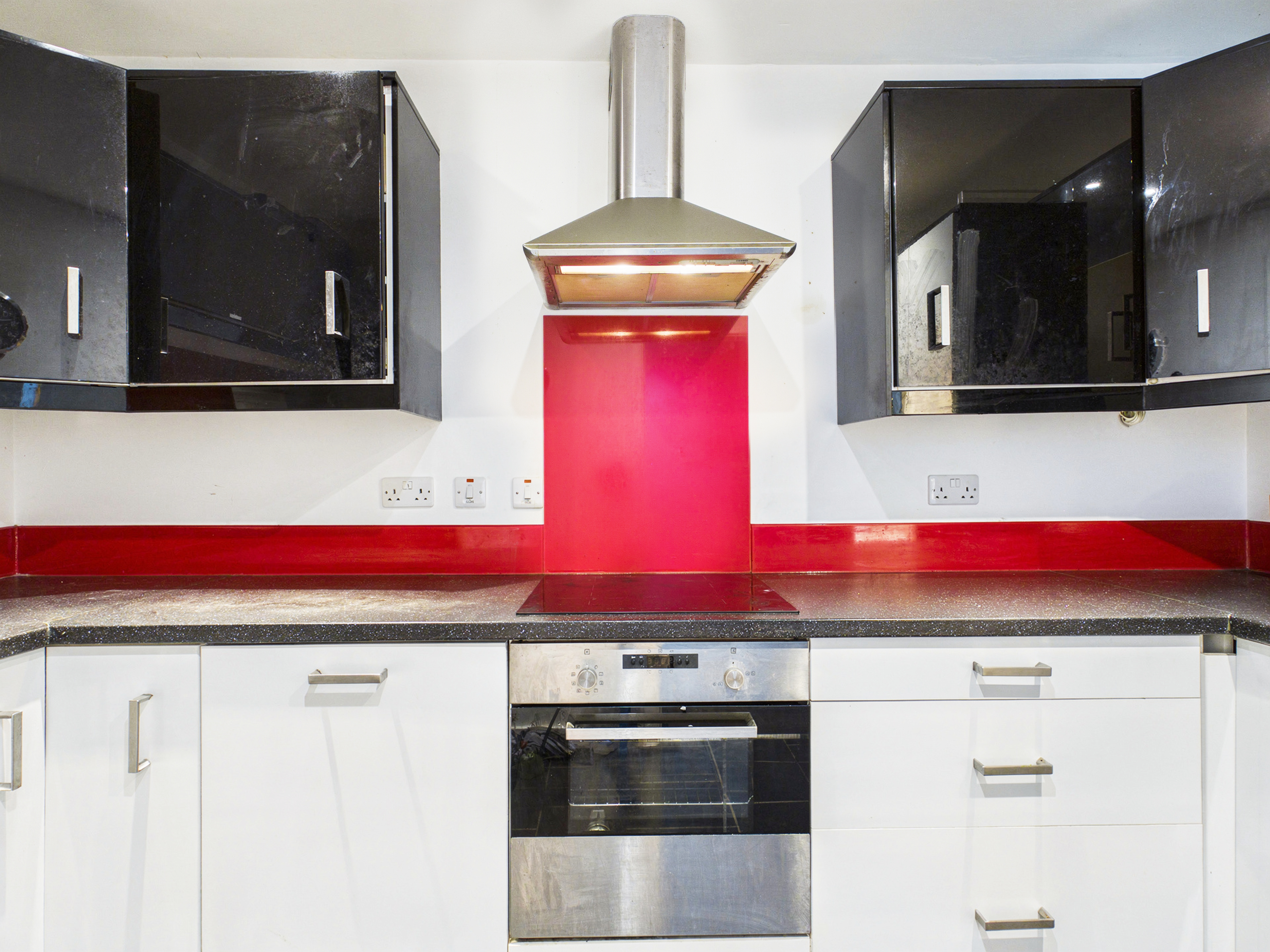 The modern kitchen is thoughtfully detailed, contrasting sleek black and white gloss cabinetry with a black quartz-effect worktop and distinctive red tiled splashbacks, all set upon stylish dark grey stone-effect floor tiles. It is well-equipped for daily use, featuring a variety of integrated appliances including an electric oven and grill, fridge freezer, a washing machine, and a dishwasher, alongside an electric hob and extractor fan. Practical additions such as both internal and under-cupboard lighting, both wired directly to the main room switches, add a highly functional and contemporary finish to this well-design space.