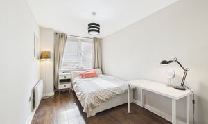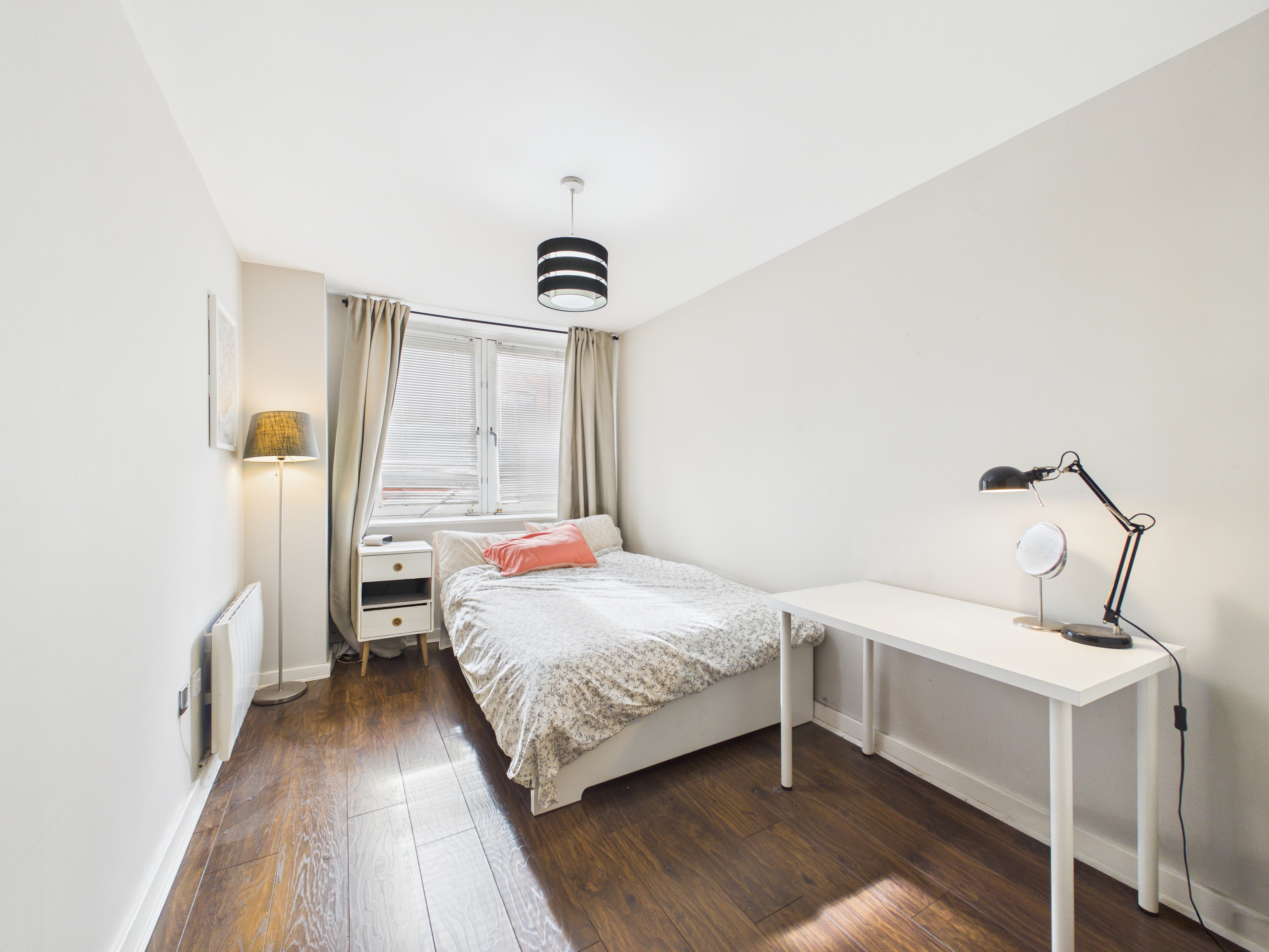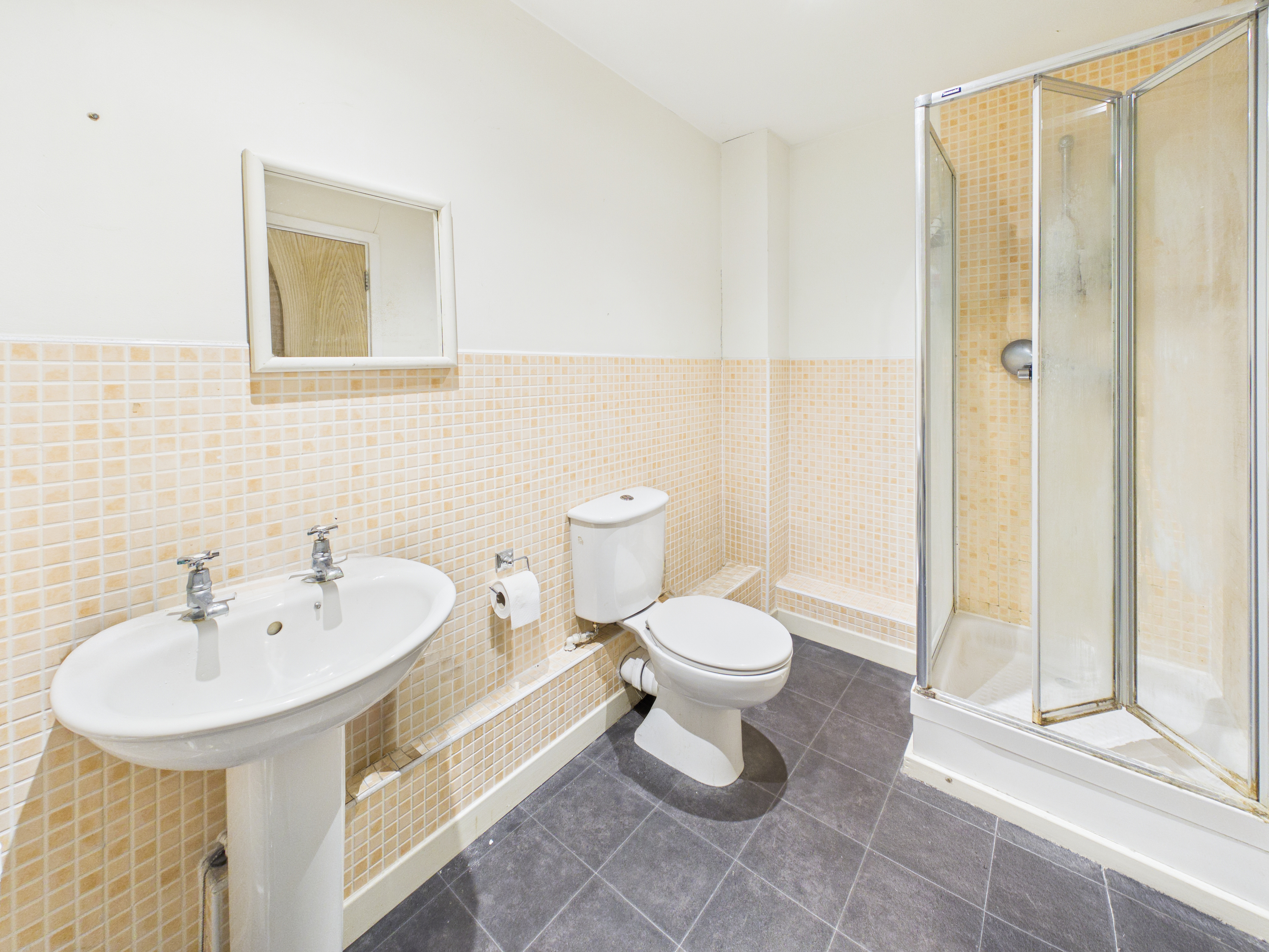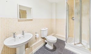 Both bedrooms are well-proportioned, neutrally decorated, and wonderfully light-filled. The principal bedroom includes a private en-suite shower room featuring a white three-piece suite with a mains shower within the cubicle, wash basin and toilet. The space is finished with cream mosaic tiles to half-wall height and dark grey stone-effect flooring. The versatile second bedroom comfortably accommodates a double bed, functioning equally well as a guest room or a dedicated home office.