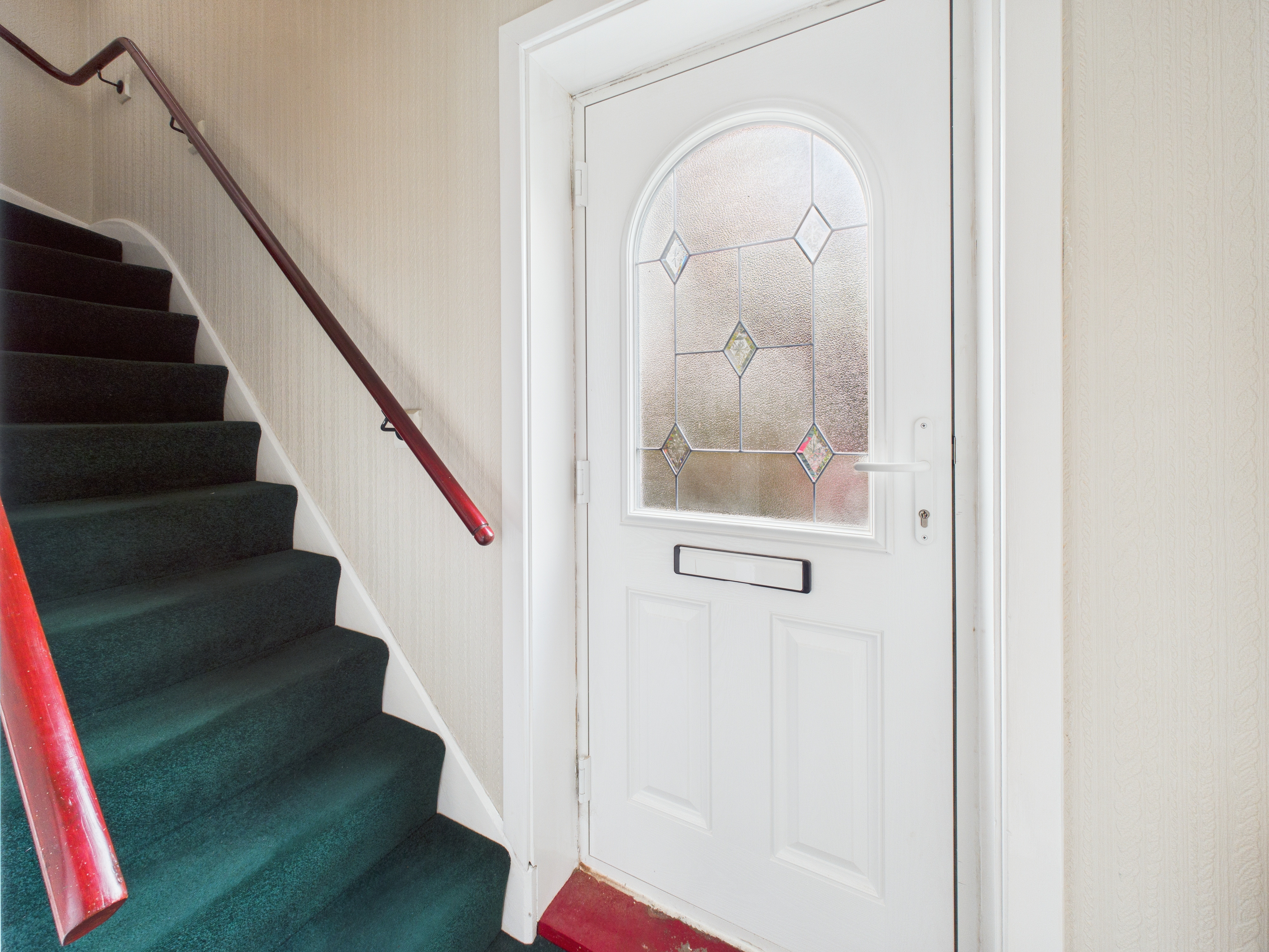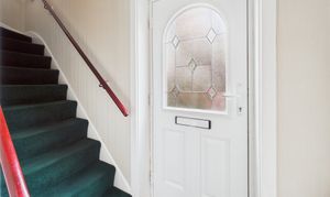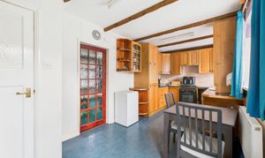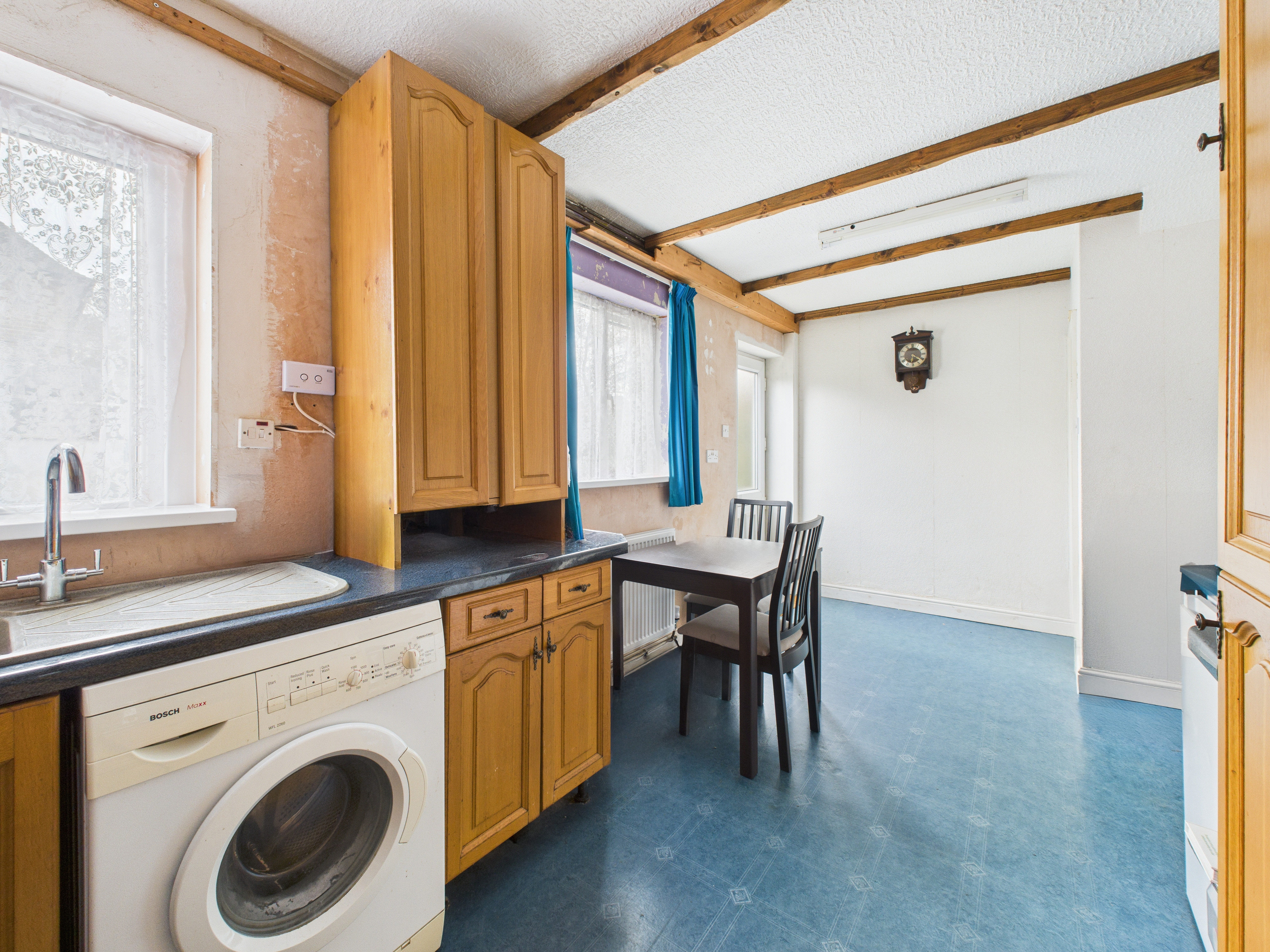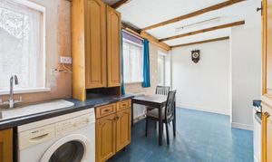 From the lounge, the accommodation flows into a well-proportioned dining kitchen. Fitted with wood-effect units and integrated cooking appliances, the kitchen also offers space for white goods and a dedicated dining area with ample room for a table and chairs. A useful under-stairs storage cupboard adds practicality, while direct access to the rear garden makes this an ideal space for everyday living and entertaining.