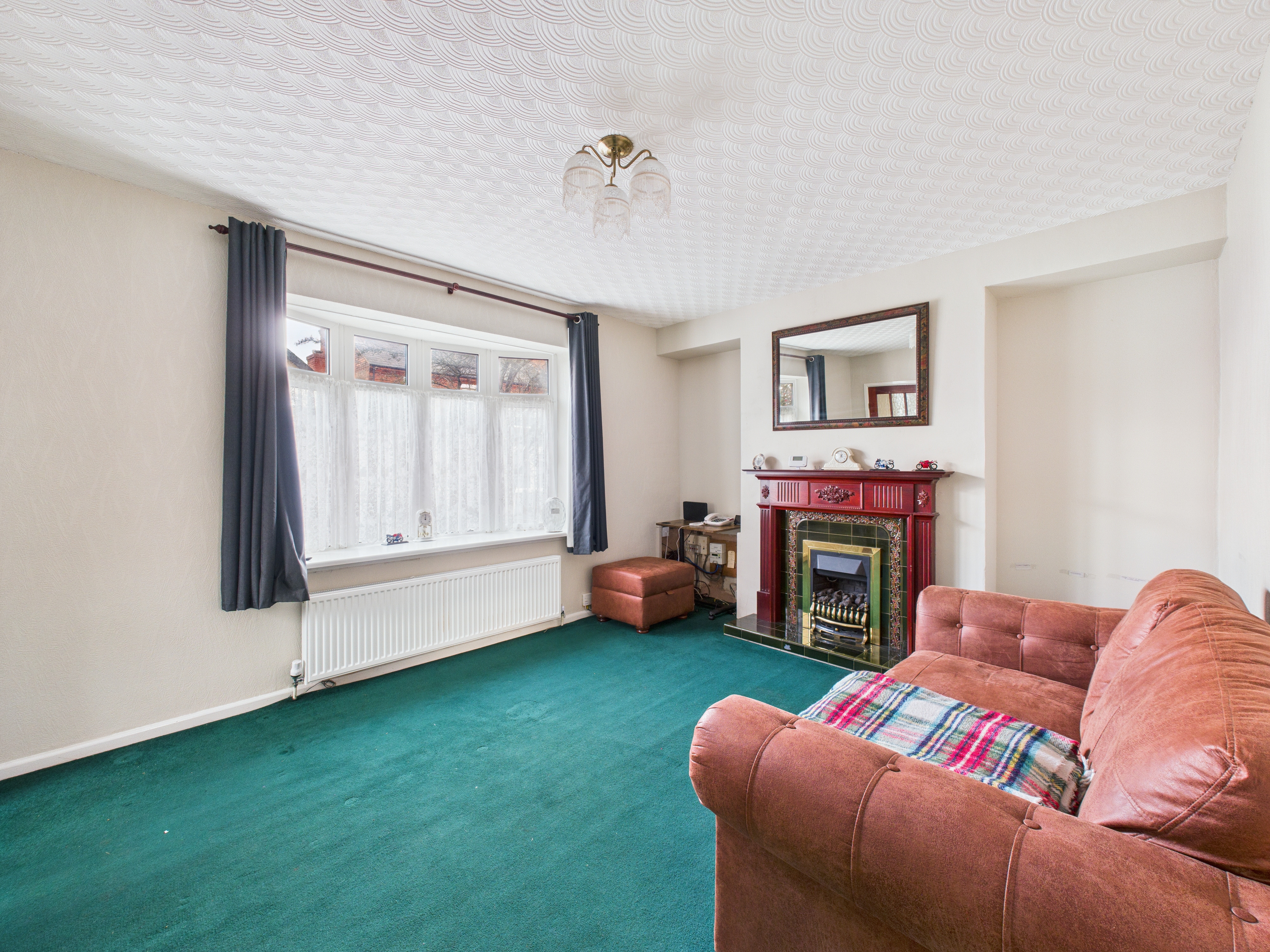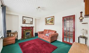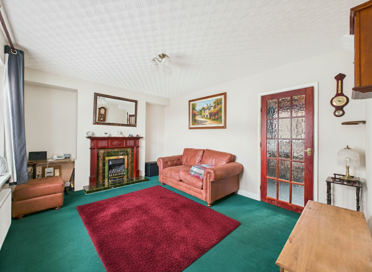 The property is entered via the hallway which leads through to a bright and spacious lounge. This inviting room enjoys a feature bay window that fills the space with natural light, complemented by a charming decorative fireplace that creates an attractive focal point.