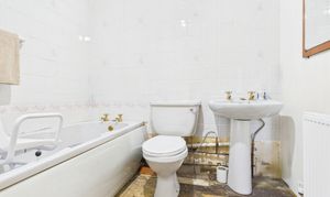 - Spacious bathroom fitted with a white three-piece suite and electric shower over the bath