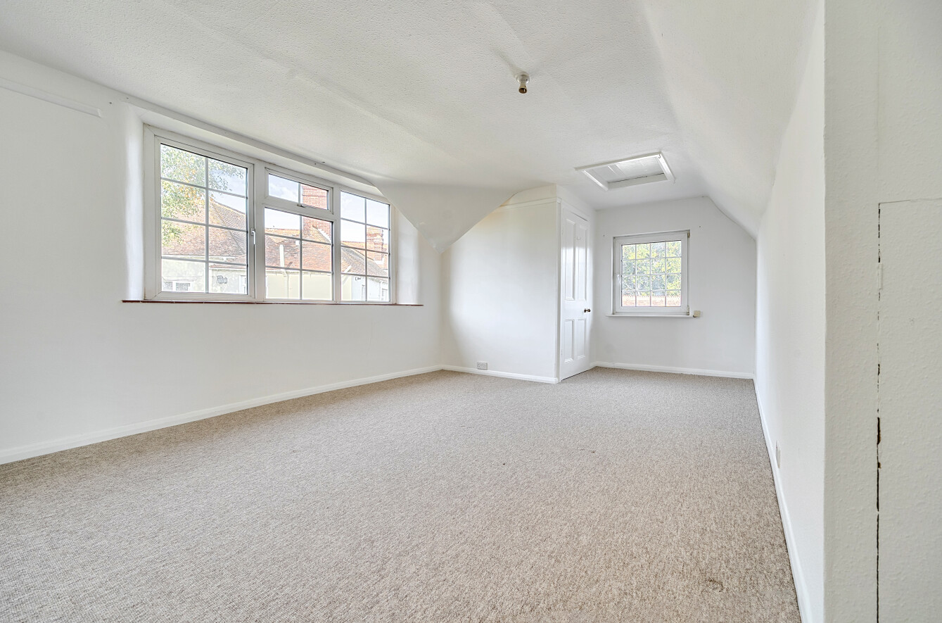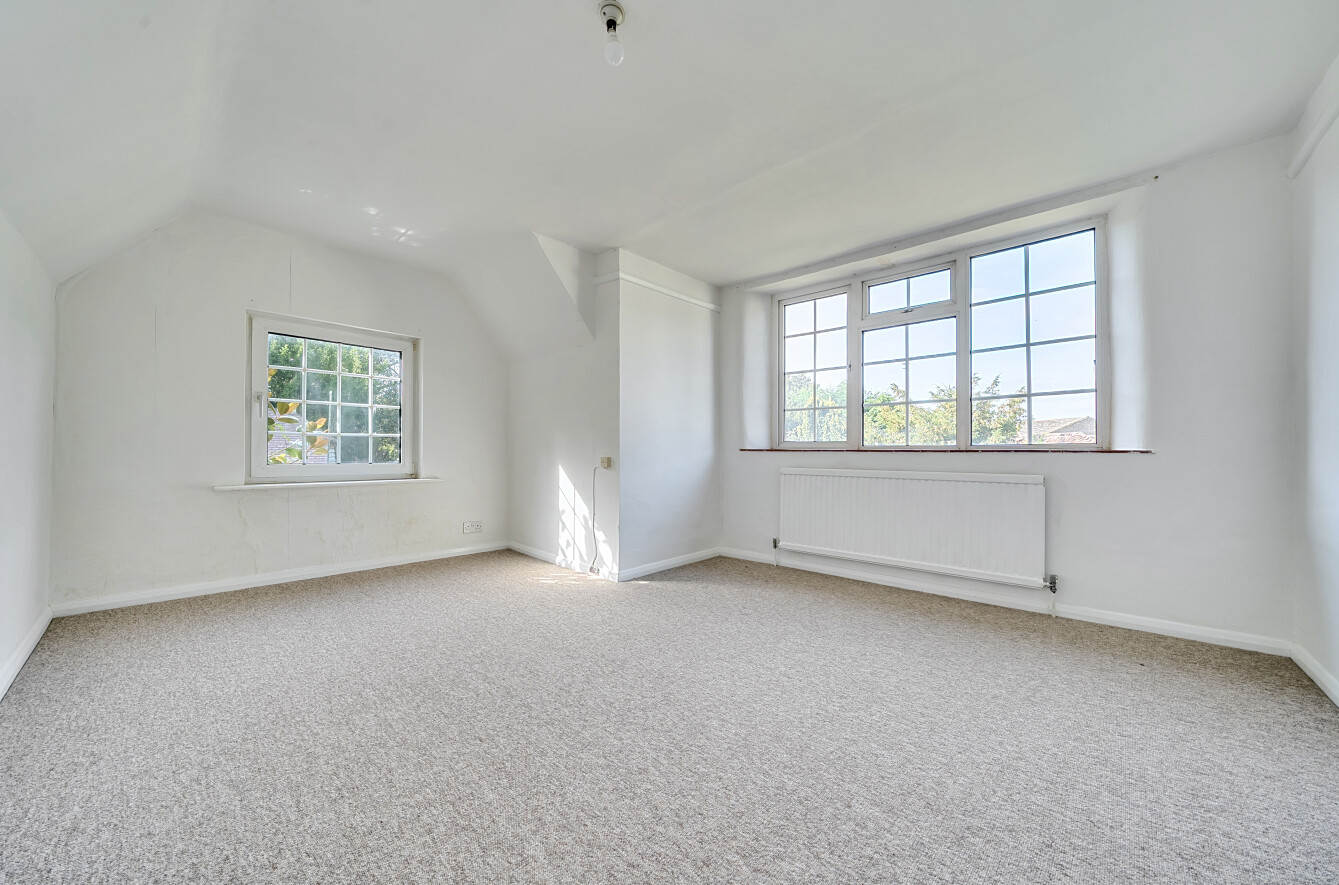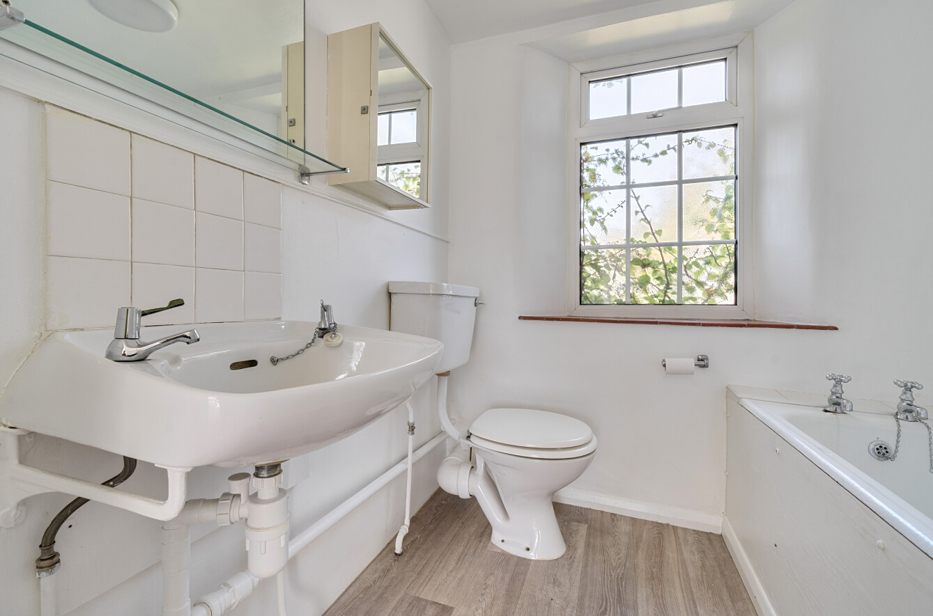 Upstairs, a generous landing leads to two well-proportioned dual-aspect bedrooms, both enjoying pleasant views over the gardens, along with a family bathroom. The layout provides comfortable accommodation that can be easily tailored to suit individual needs.
