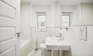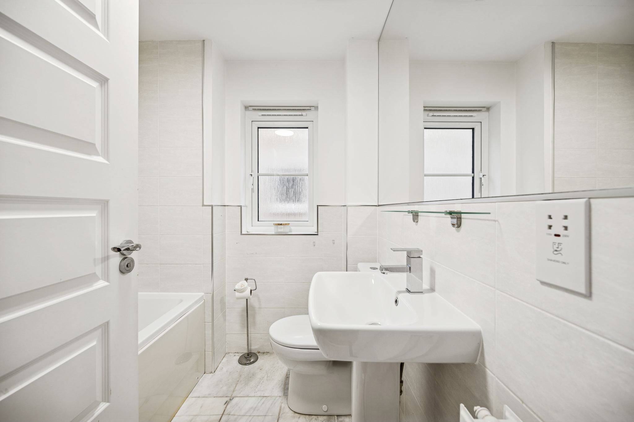 Along the hallway you reach the family bathroom which has been finished to a high standard with real marble tiling and a full mirrored wall that gives the room the feel of a boutique hotel. Additional built-in shelving and a modern suite complete the space.