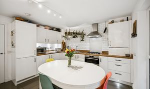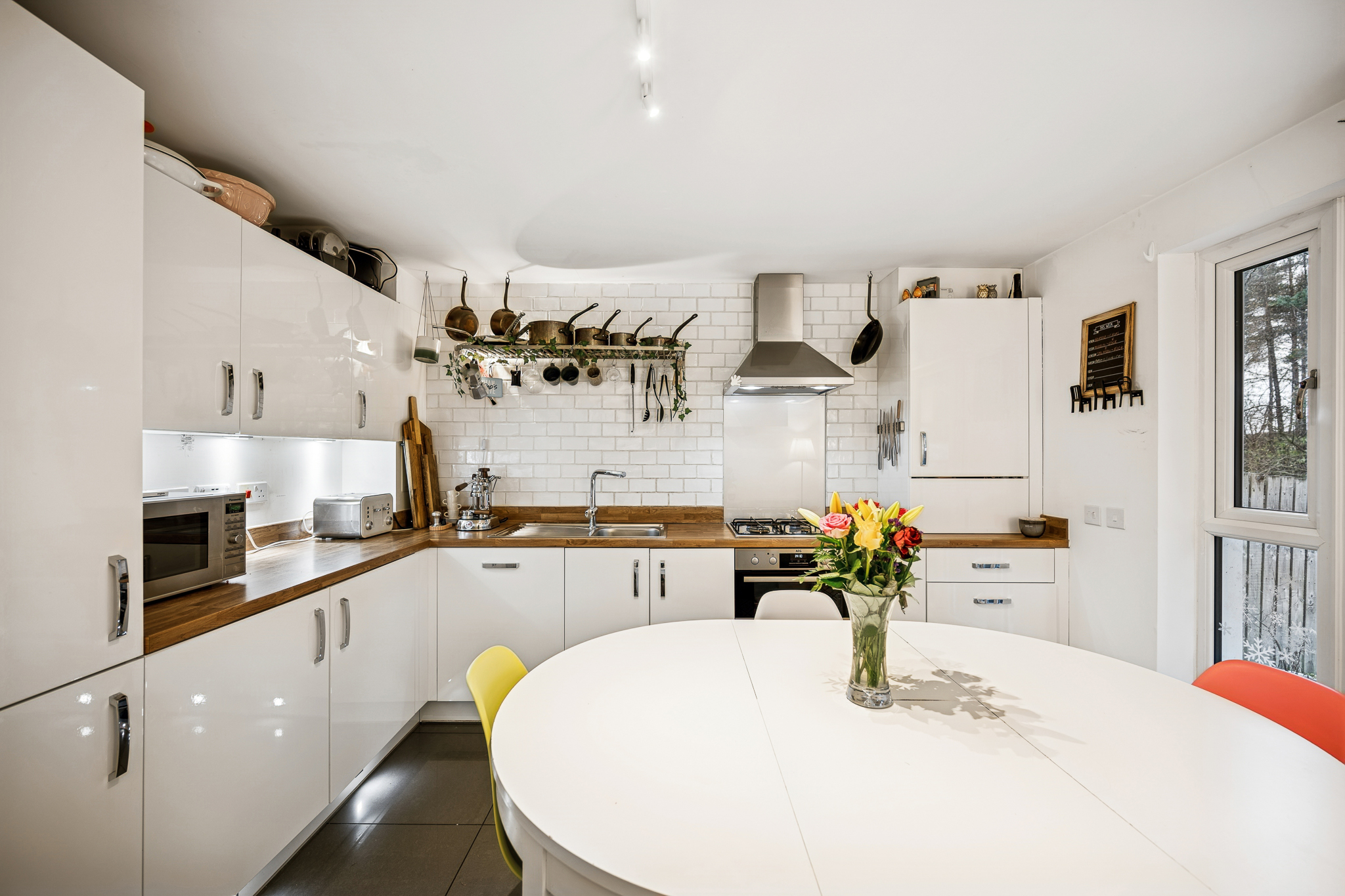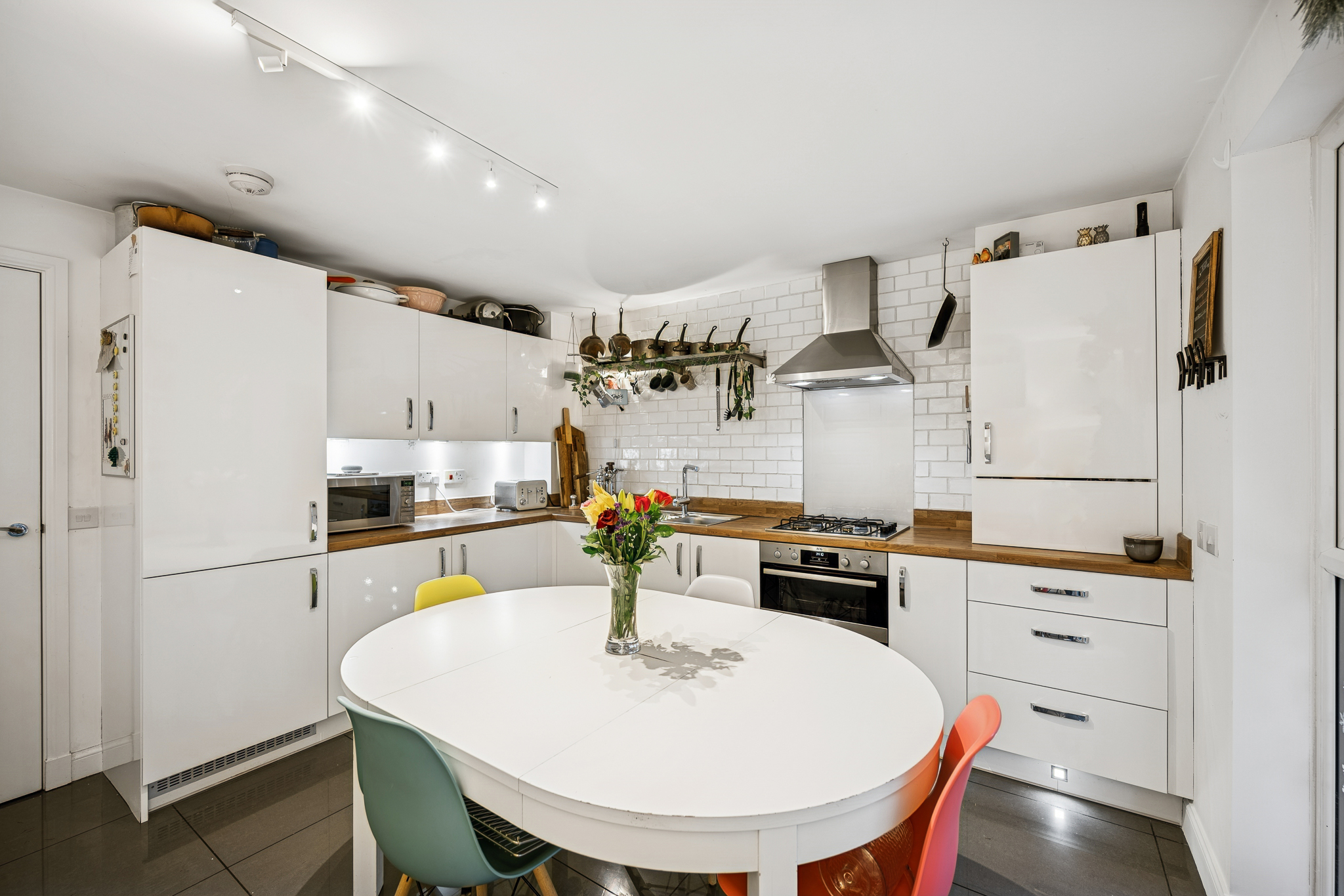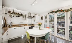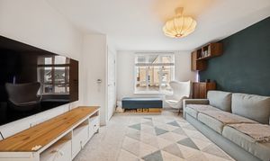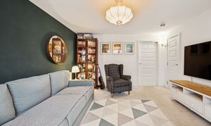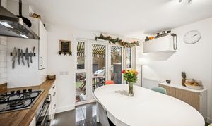 The kitchen has been significantly refreshed, offering a bright and functional space with good cabinet storage and upgraded finishes including a full-height Portuguese country-style tiled splashback, bespoke feature shelving and a high-quality Grohe extendable tap. The porcelain tiling continues through this room, enhancing durability and ease of maintenance. From here, patio doors open directly out to the south - west facing rear garden, allowing natural light to pour into the room and offering a lovely connection between indoor and outdoor living.