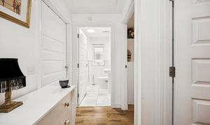 Entering the home, you walk into a practical hallway that creates a clear transition between the outdoors and the comfort of the interior, with porcelain tiling flowing through this space and into the main living areas to create a clean, cohesive feel.