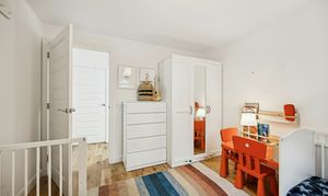 Heading upstairs, the first room on the left is the principal bedroom. This room has been thoughtfully enhanced with a converted cupboard that now serves as a mini walk-in wardrobe complete with shelving and lighting.