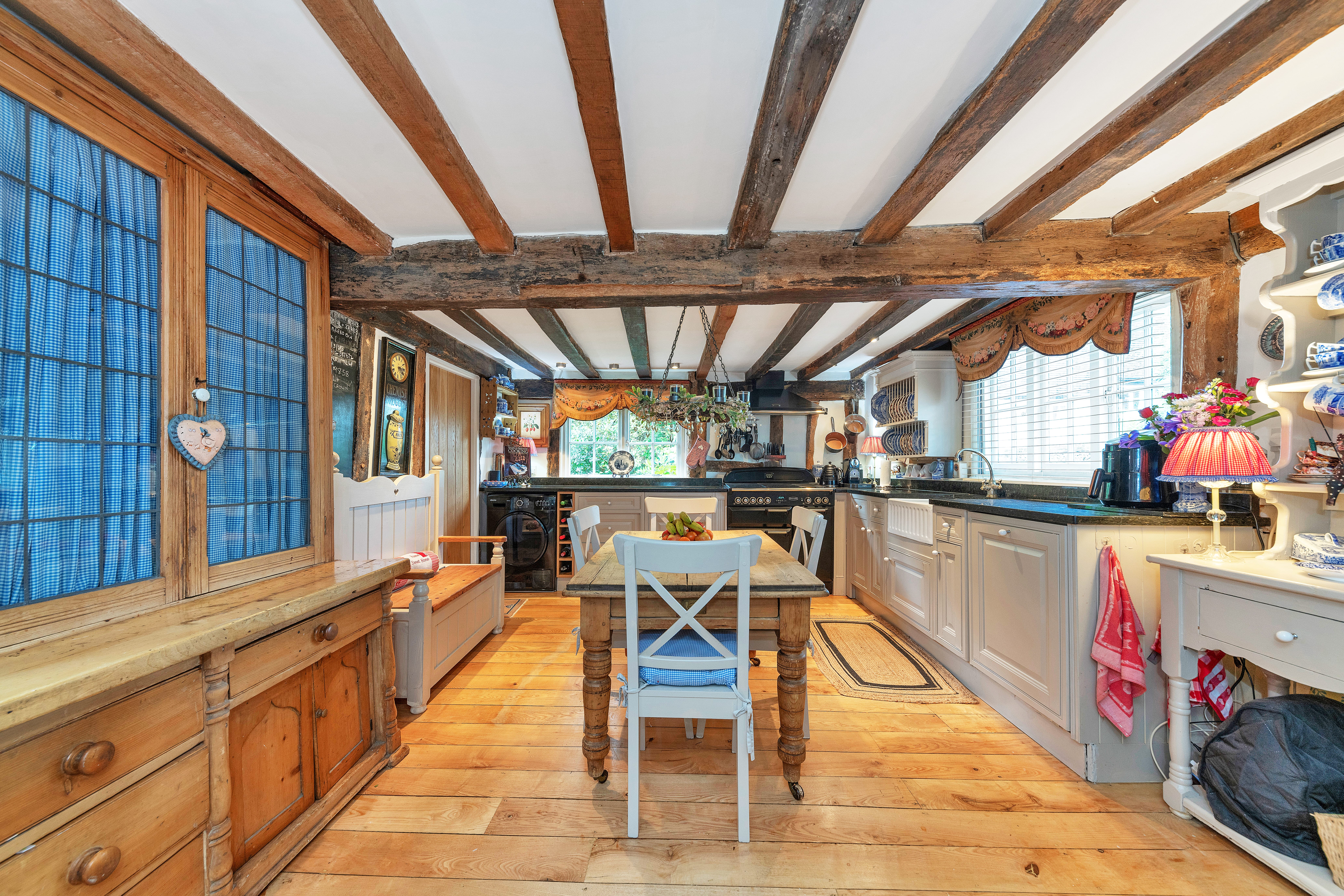 The kitchen/breakfast room is a magnificent space, with 2 windows to a dual aspect, stunning exposed beams and upstands, a wide range of modern base units, granite worktops, wood flooring, stairs down to a large cellar, a range cooker, a butler sink, an integrated dishwasher and extractor hood, and space for a fridge/freezer, tumble dryer, dining setting and smaller kitchen appliances.