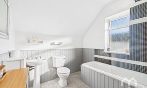 Four piece suite including panelled bath with shower over (mains connect), pedestal hand wash basin and W.C. Part tiled walls. Laminate floor. Window to side.