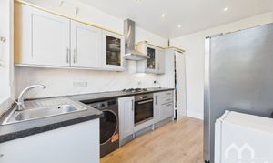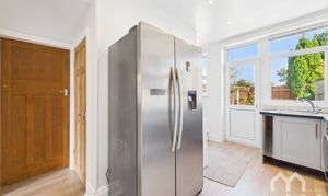 Good range of eye and low-level units including stainless steel sink with drainer. Integrated appliances include electric oven with gas hob. Space plumbed for washing machine and free standing fridge/freezer. Understairs storage cupboard. Laminate floor. Window to rear. Patio door to rear.