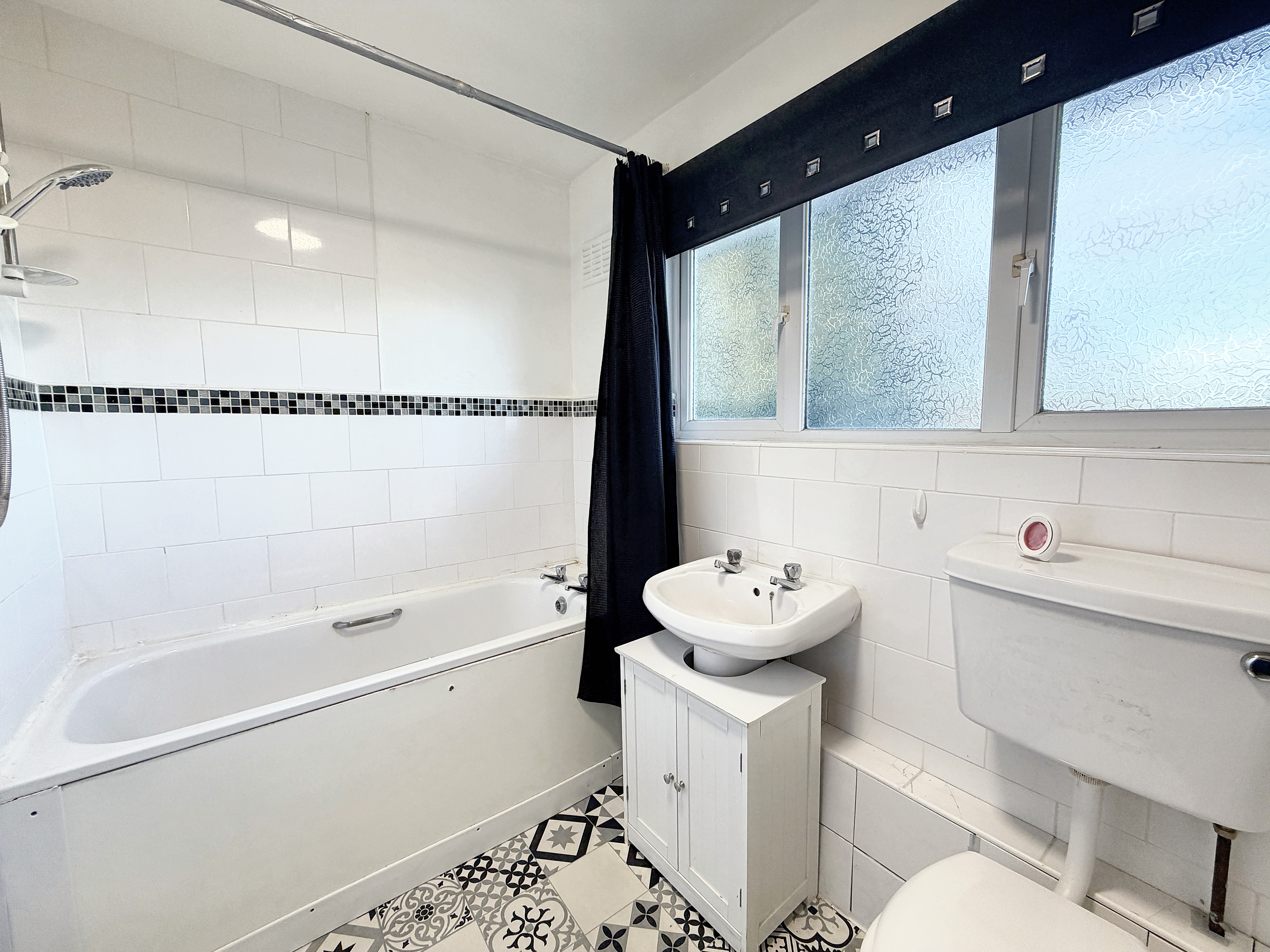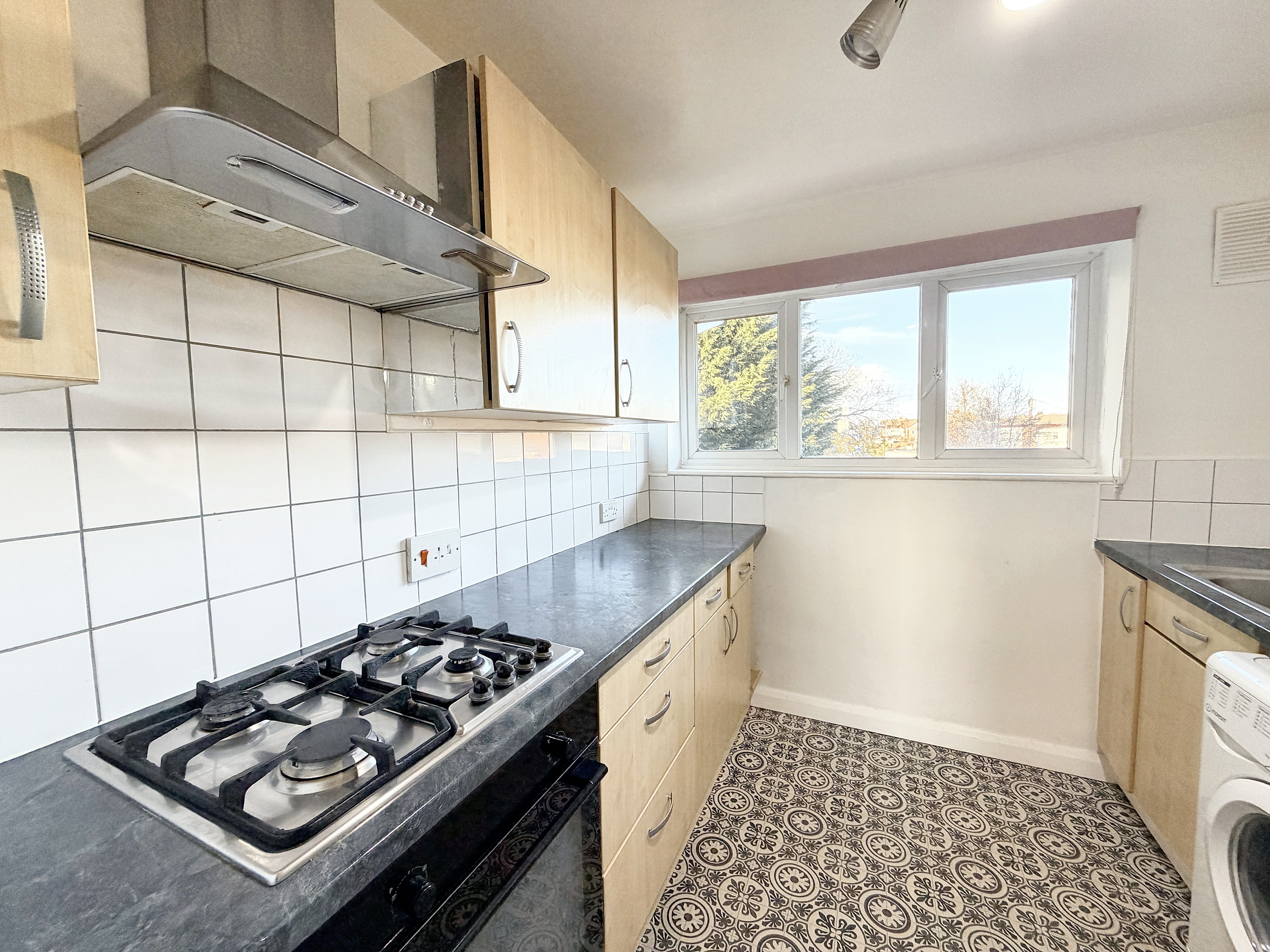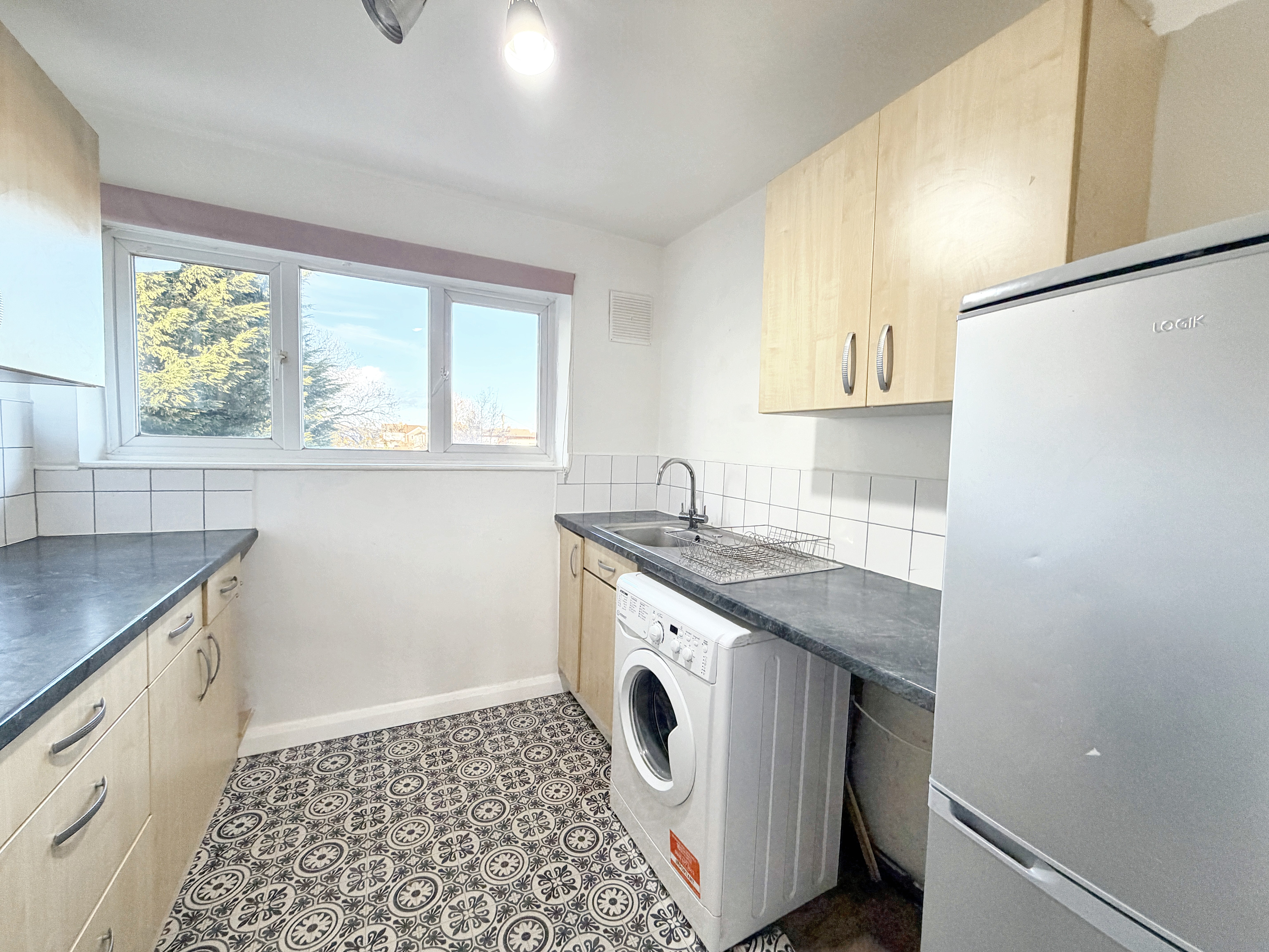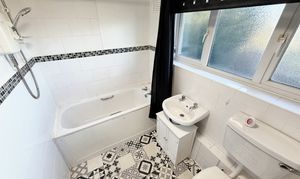 The apartment is equipped with gas central heating, ensuring warmth and comfort year-round. The kitchen is thoughtfully designed with practical storage and workspace. The bathroom is well sized with a shower over the bath.