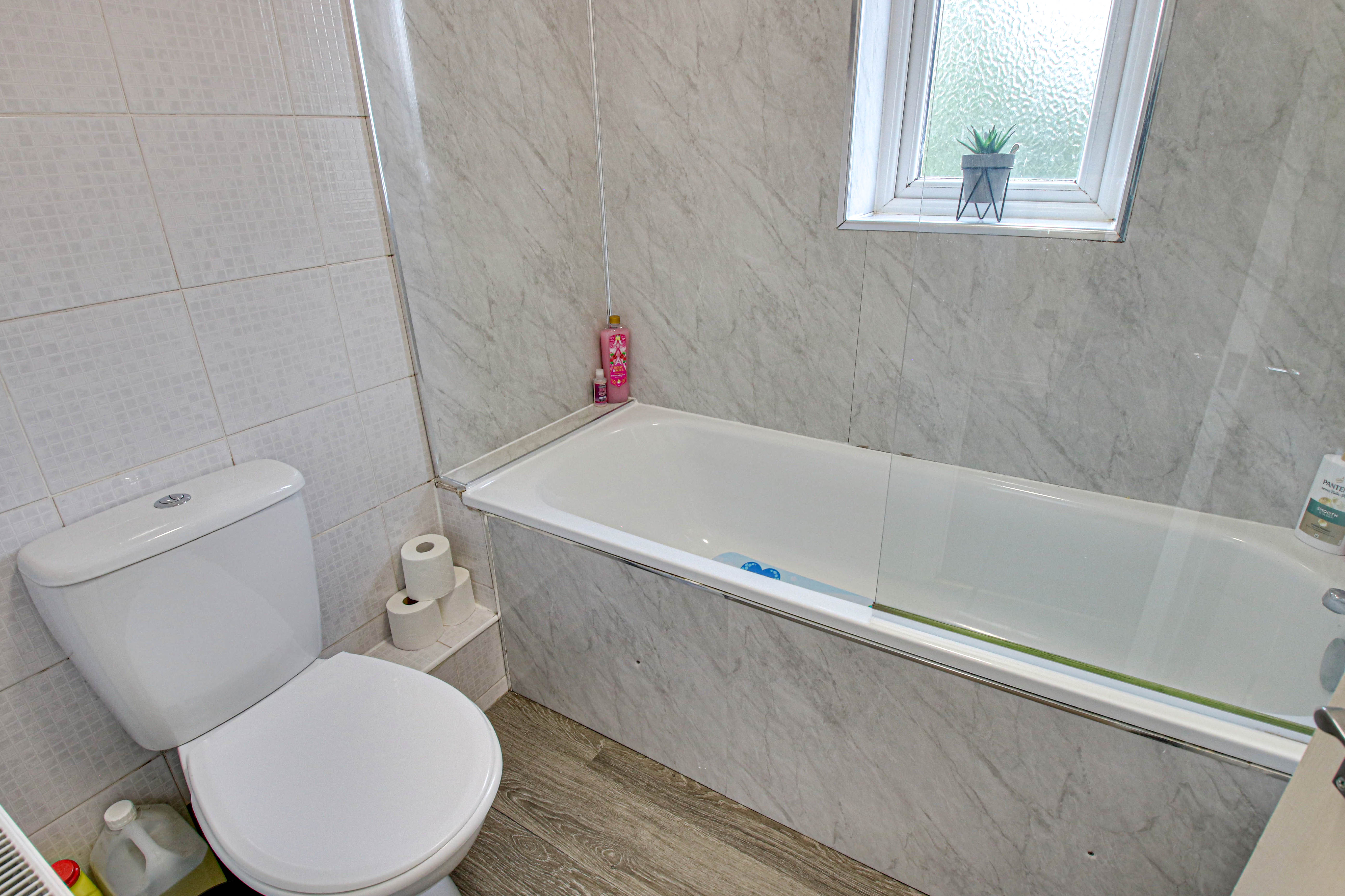 Rear facing upvc window, panel bath, over bath shower, WC, wash basin, marble effect splash back panels and radiator.