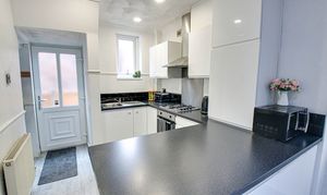 Side facing upvc window and door, french door to Conservatory, fitted range of base and wall units, electric oven, gas hob, breakfast bar, understairs store and radiator.