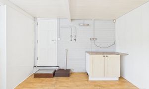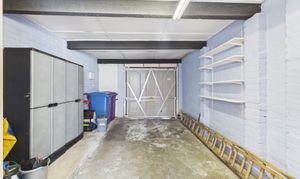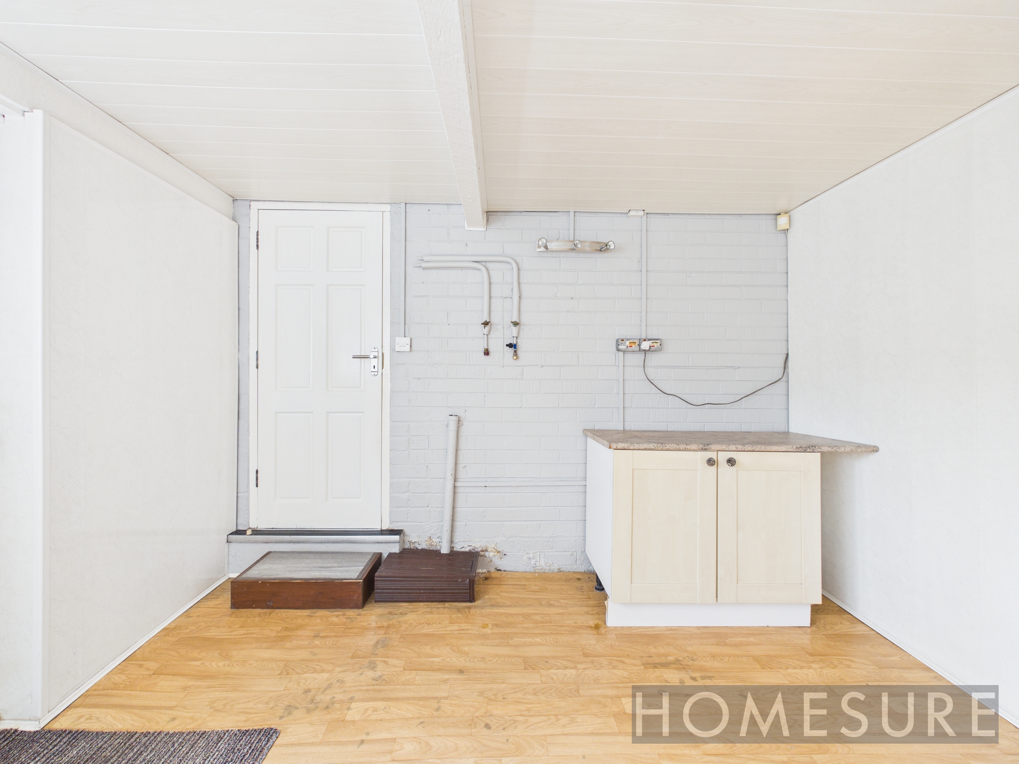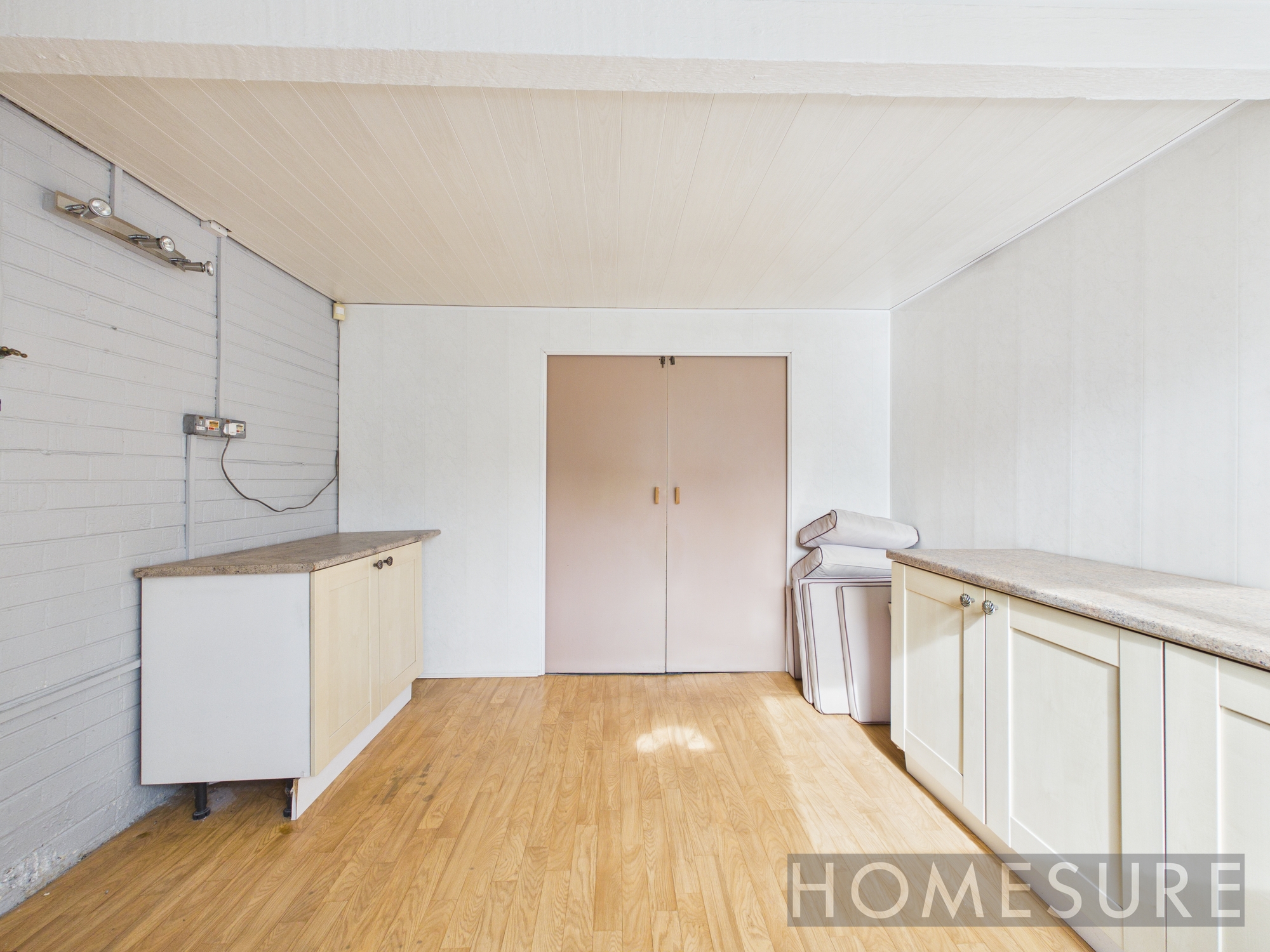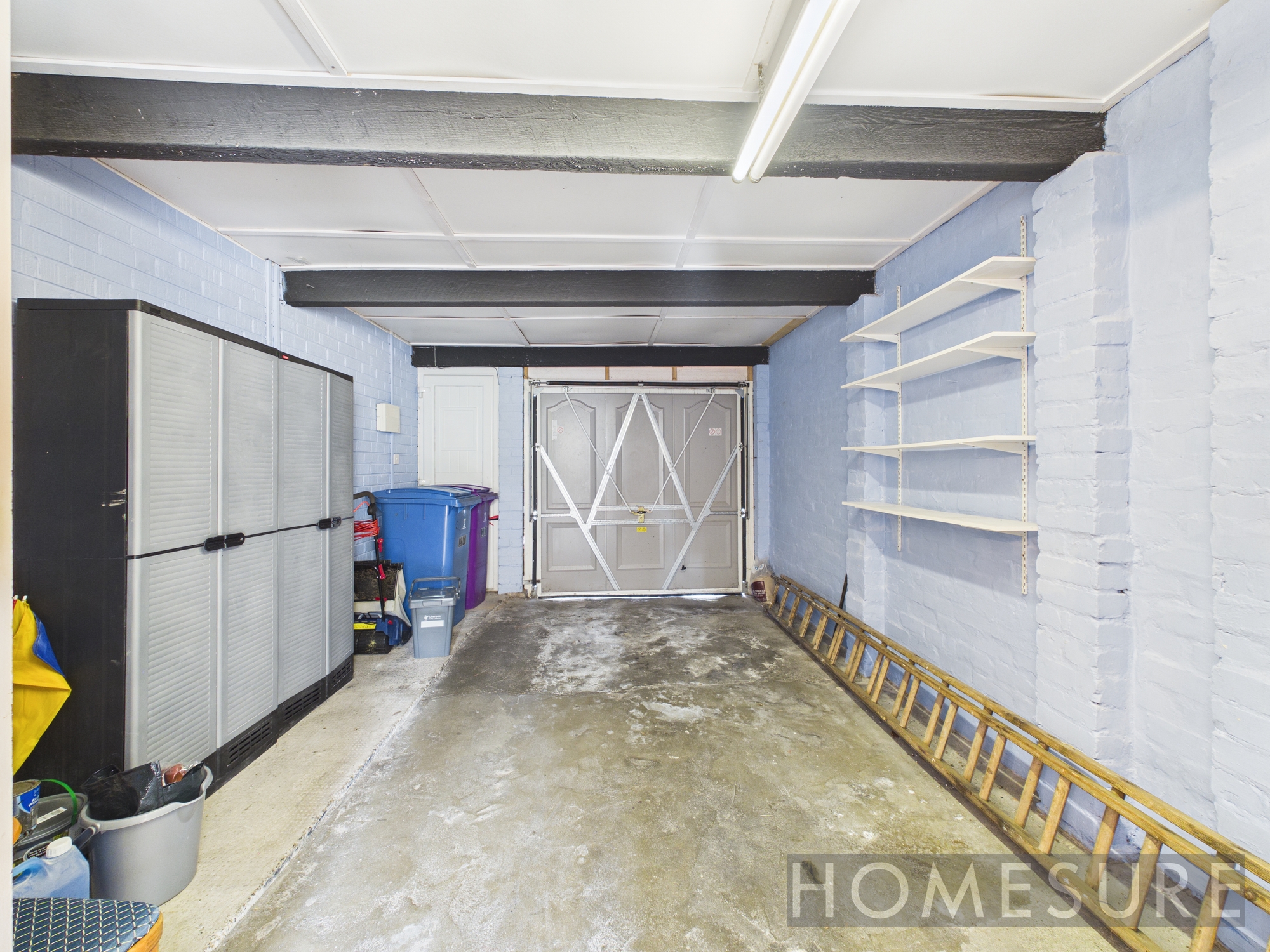 The property also offers a paved driveway with ample off-road parking and an attached, secure garage complete with built-in shelving for additional storage or workshop needs.