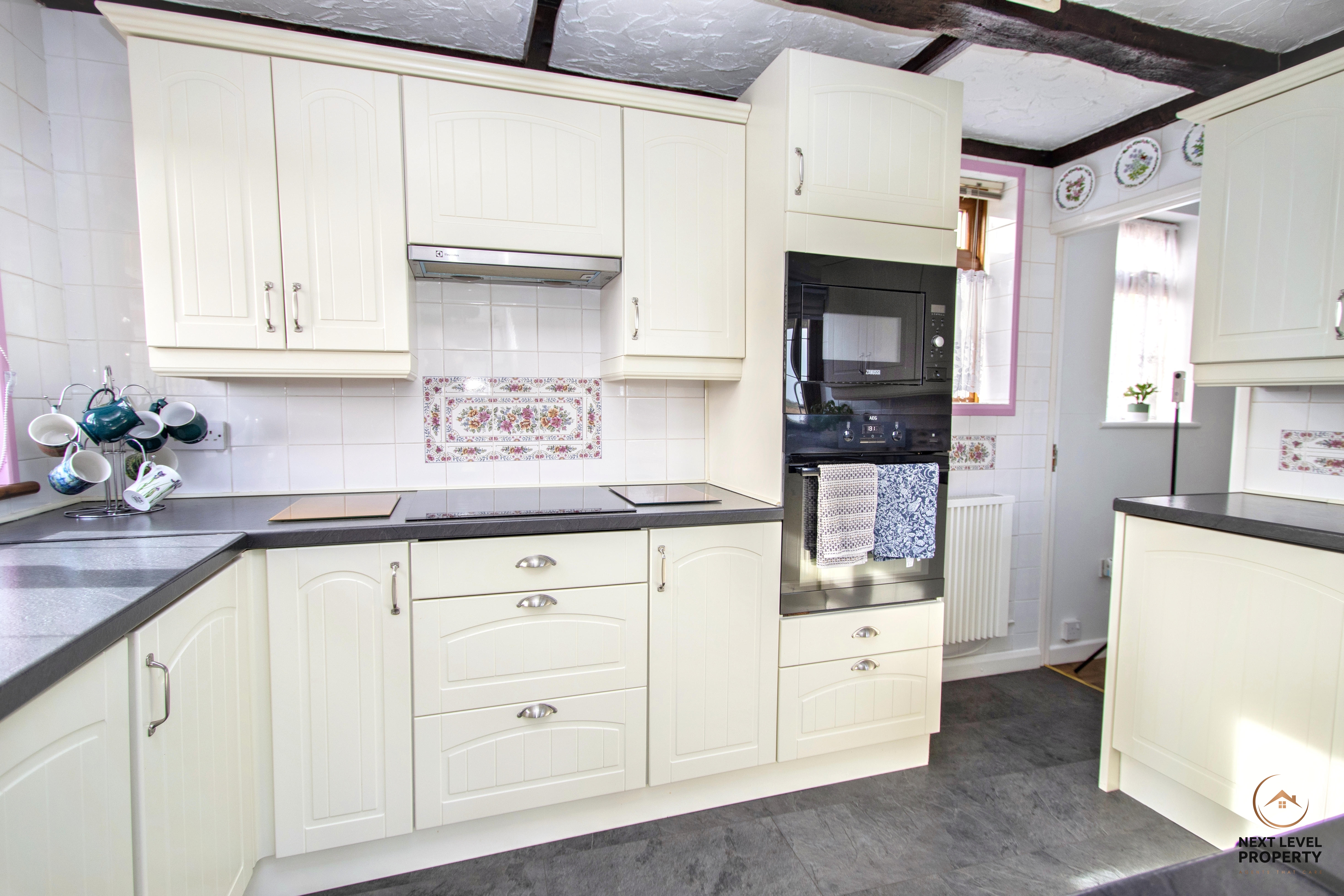 - Cottage-style kitchen with integrated appliances