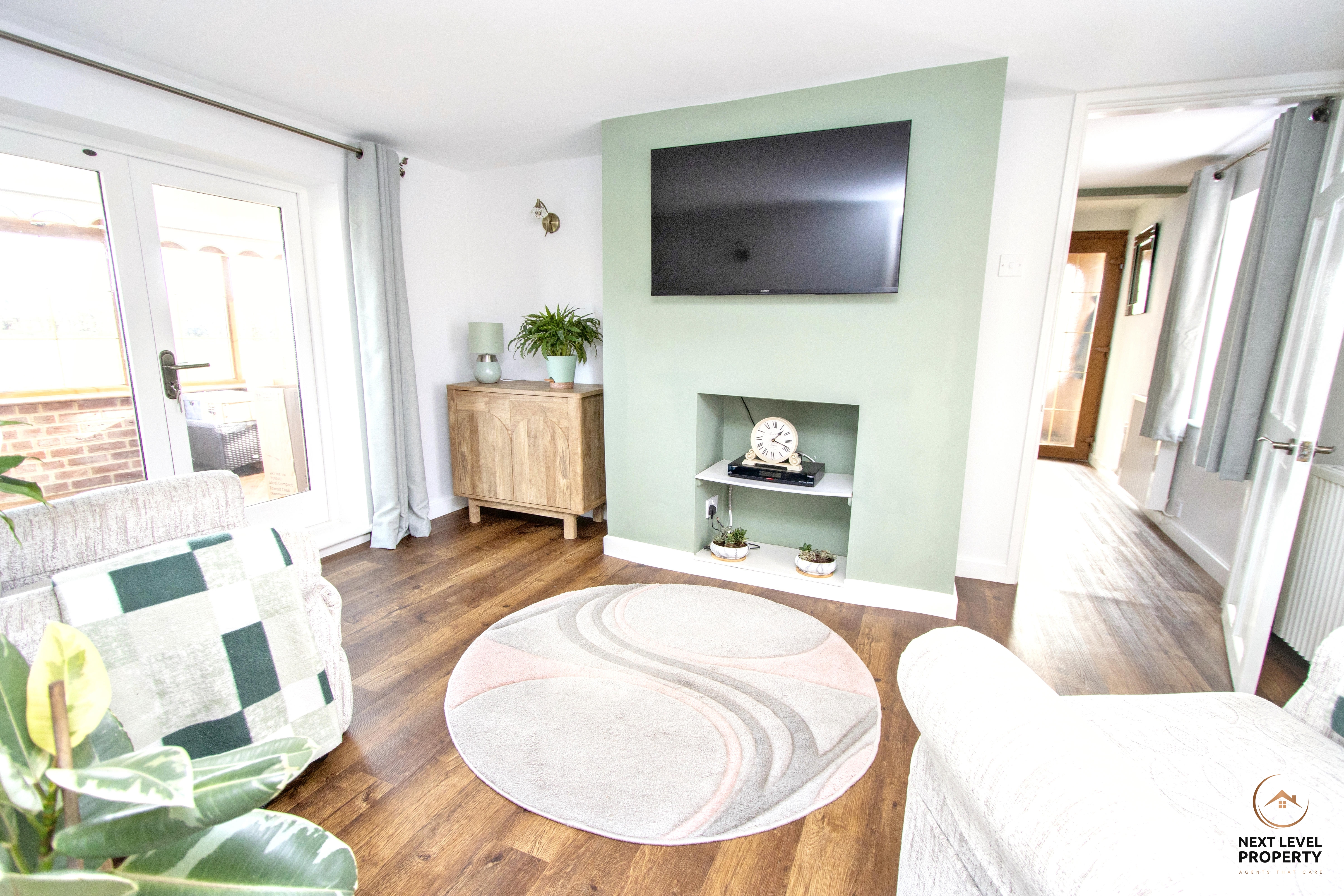 A welcoming and intimate living space, perfectly suited to cosy evenings in. The chimney breast provides a natural focal point, adding character and warmth to the room, while a uPVC window to the front elevation allows plenty of natural light to filter through. There is direct access to the office/bedroom three, offering flexibility for modern living, and French doors open through to the conservatory, creating a seamless connection to the garden and countryside beyond.